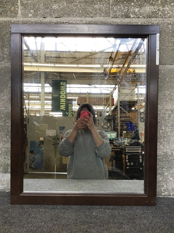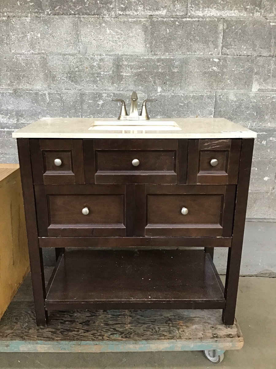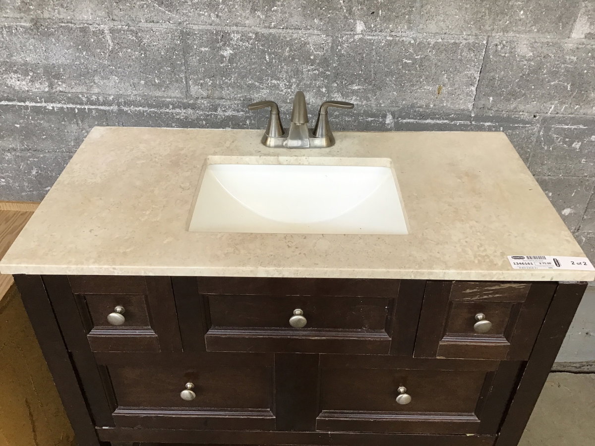Modern vanity base cabinet with moulded plastic countertop and nickel faucet, matching mirror measures in at 25.75 x 31.5 and can be hung horizontally or vertically. Shows signs of water damage on the upper portion of the face, price reflects.