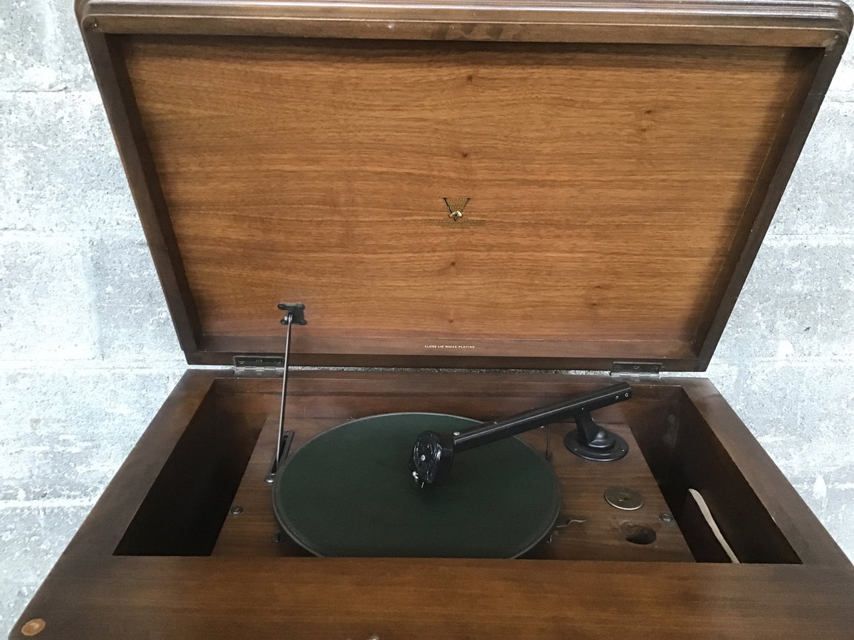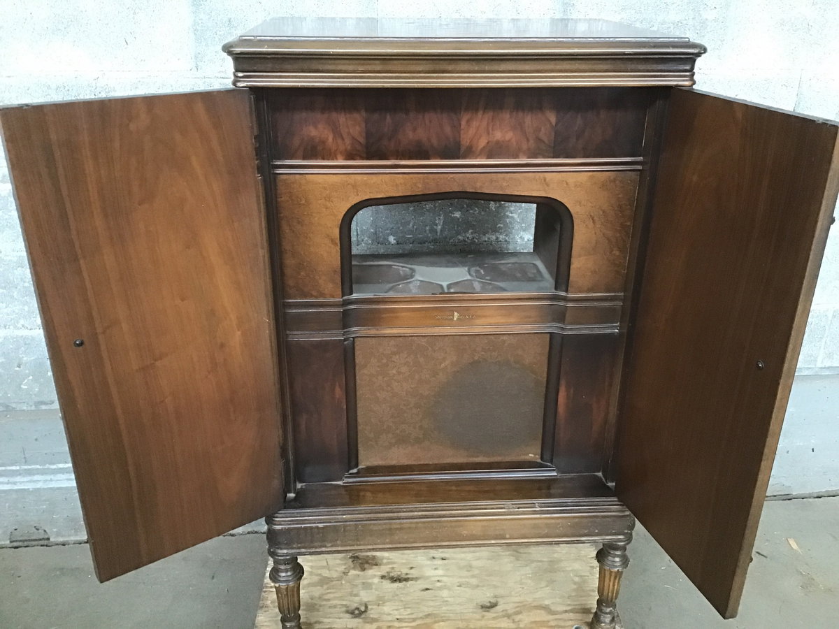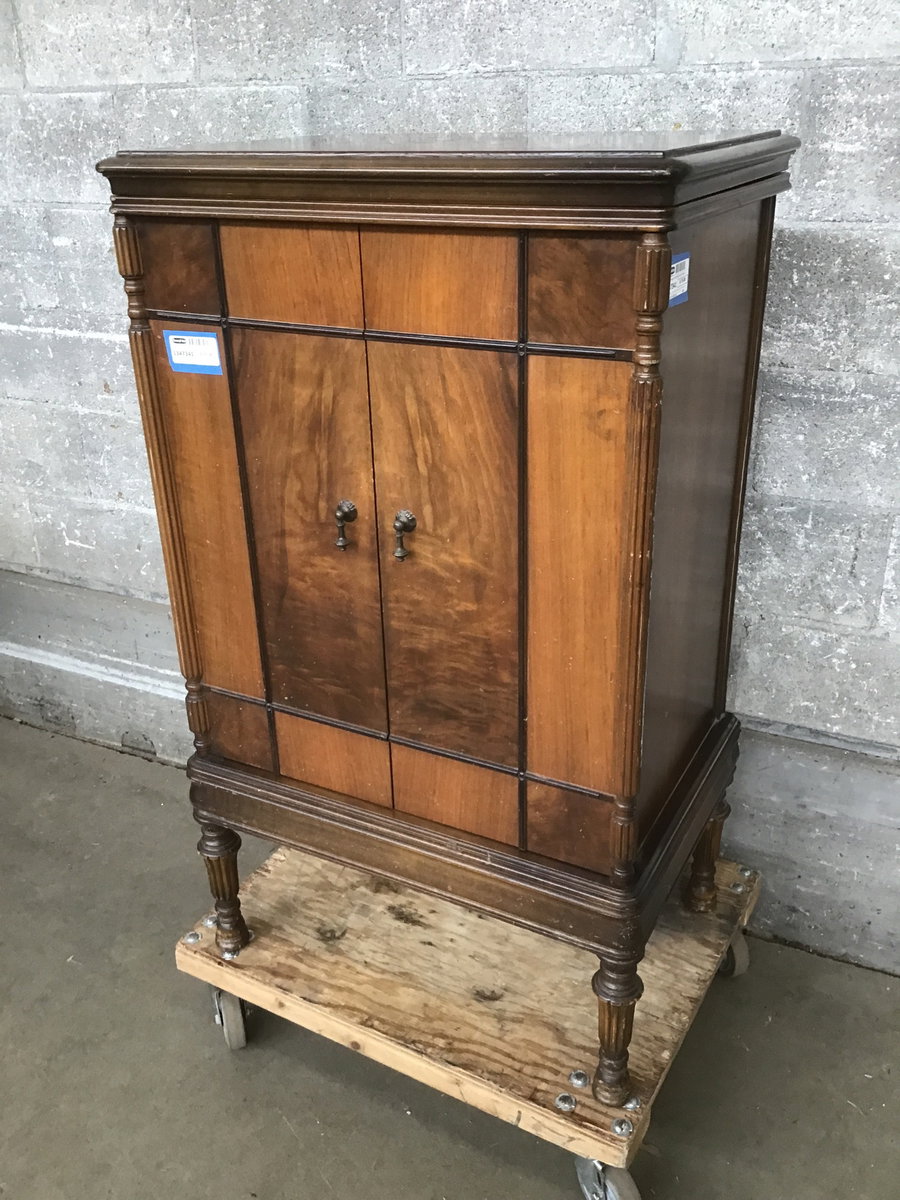 Nice looking vintage, possibly antique, Victor phonograph & radio cabinet. The speaker & radio have been removed, and there looks to be nothing to "drive" the turntable. With a little creativity, this could make a fine bar cabinet.