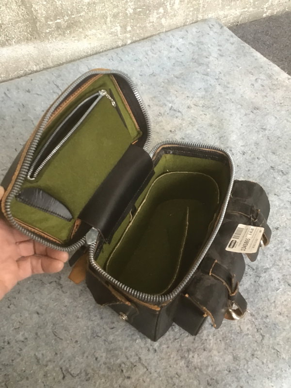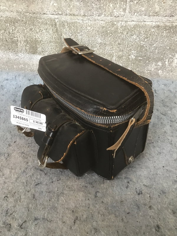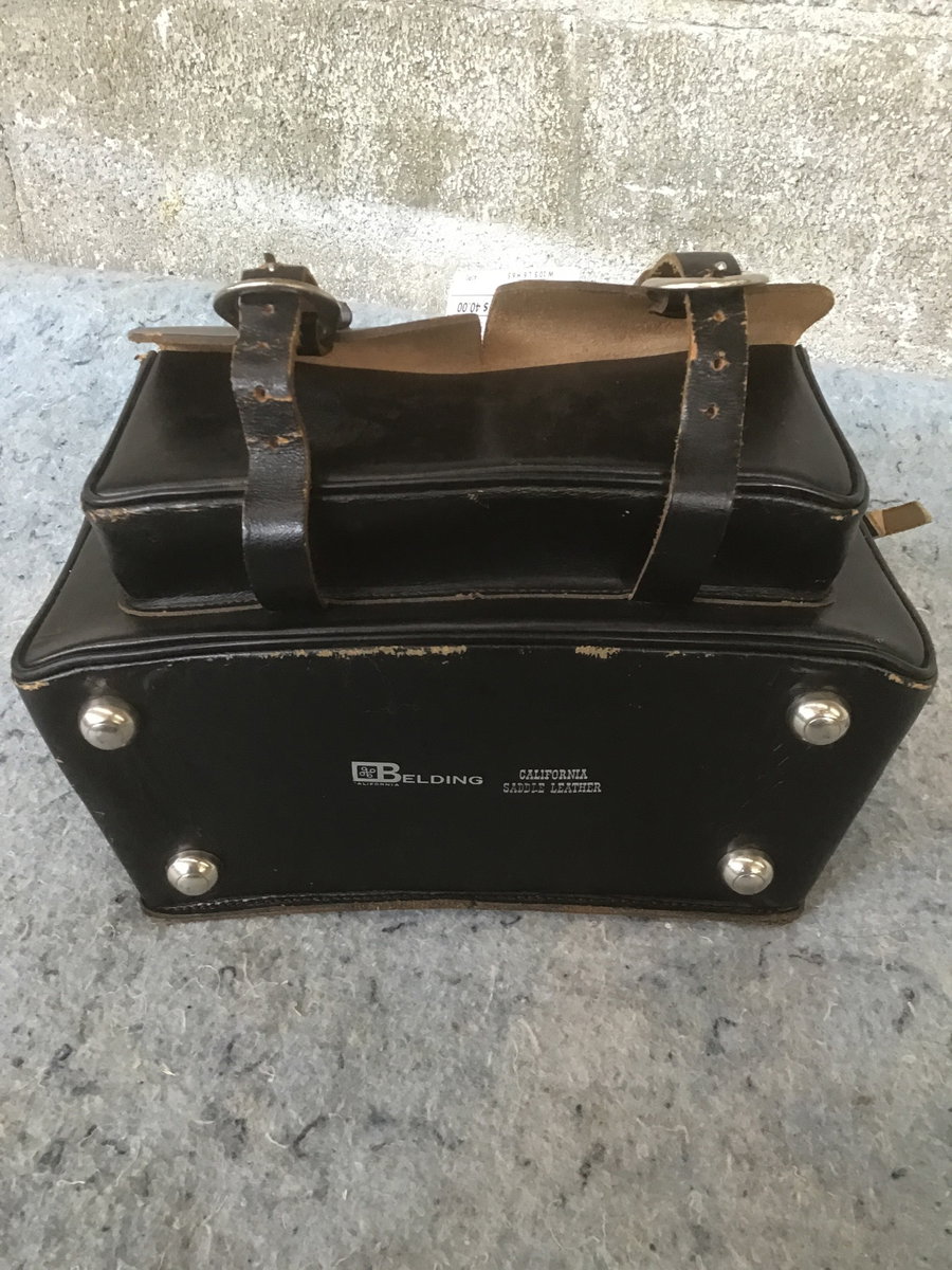 A vintage leather camera bag made by Belding California, looks to be circa 1970s or so. Has a black finish and is in pretty good shape overall, with some wear on the strap and a few corners. It's chock full of charm and clean inside - ready to store your cameras for many more years!