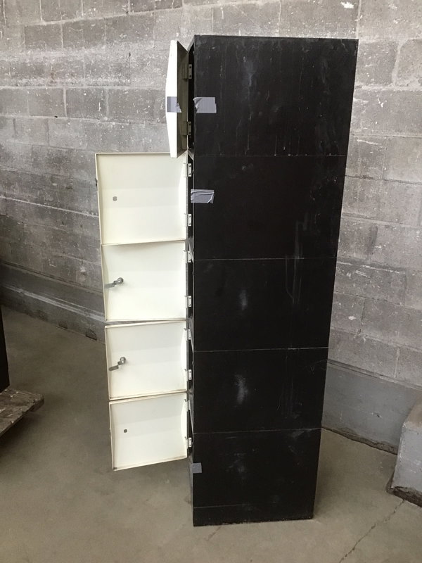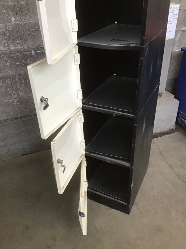 A groovy bay of 5 small lockers with key locks in white with "wood grain" accents. These came to us from Skyway Park Bowl! Photos may be representative.