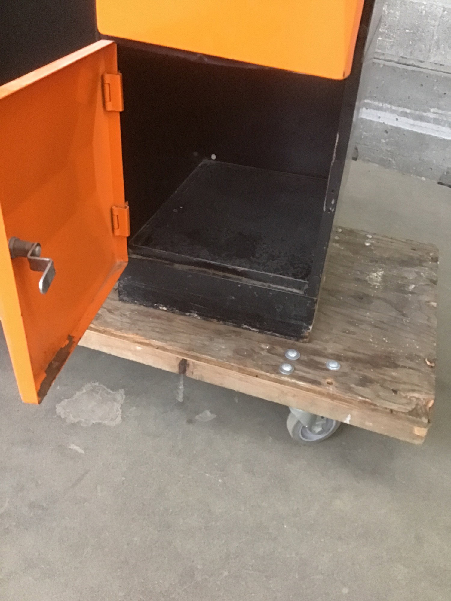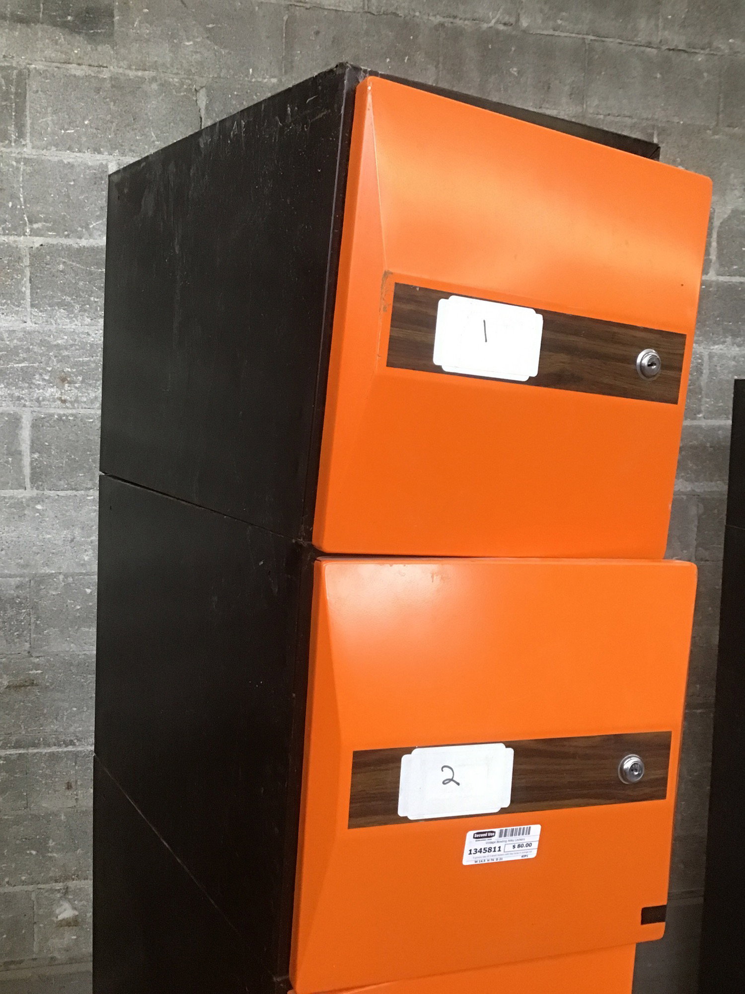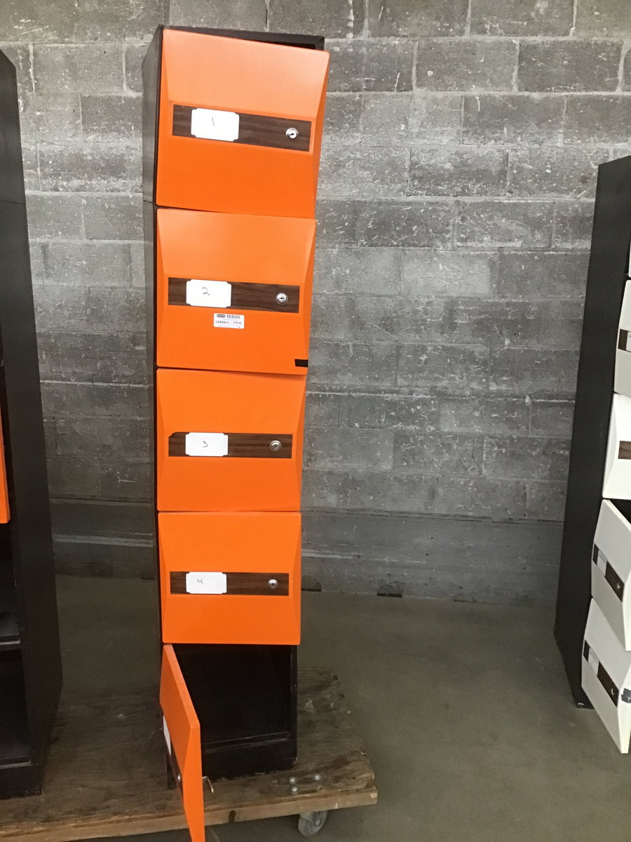 A groovy bay of 5 small lockers with key locks in orange with "wood grain" accents. These came to us from Skyway Park Bowl! Photos may be representative.