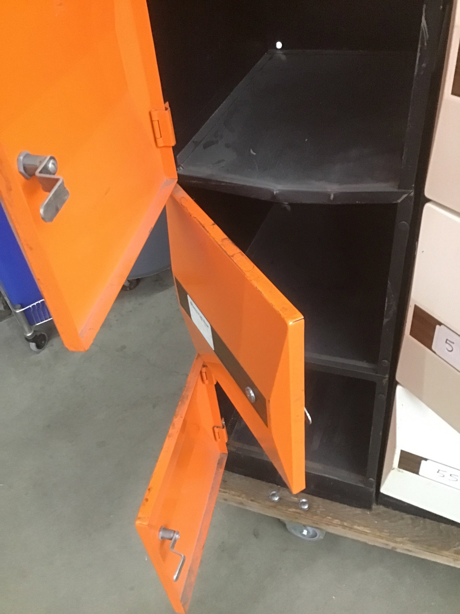 A groovy bay of 5 small lockers with key locks in orange with "wood grain" accents. These came to us from Skyway Park Bowl! Photos may be representative.