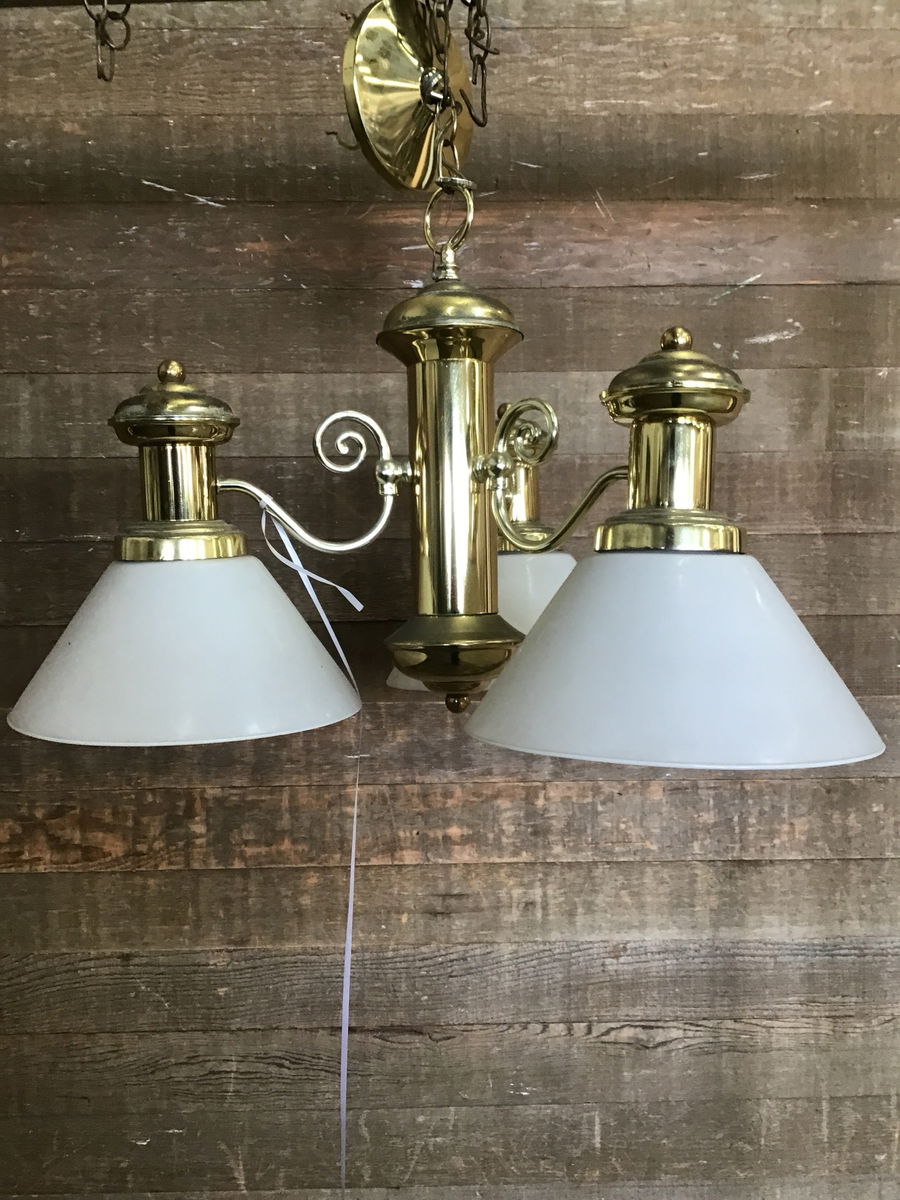 3-light brass finish chandelier. Body is made of metal, wiring is in good condition and has some incredible milky white glass shades. Finish could use some work if you're a perfectionist and chain is pretty short but light is in overall good condition.