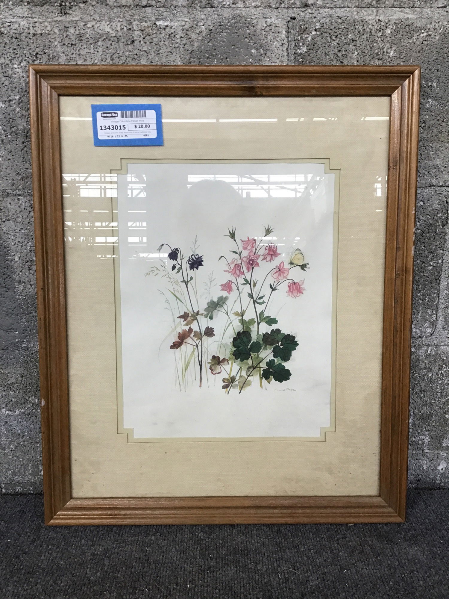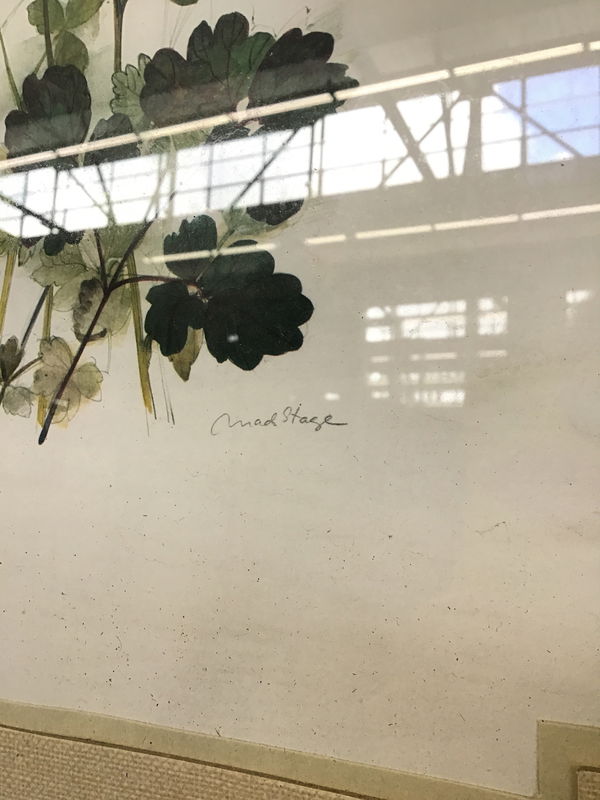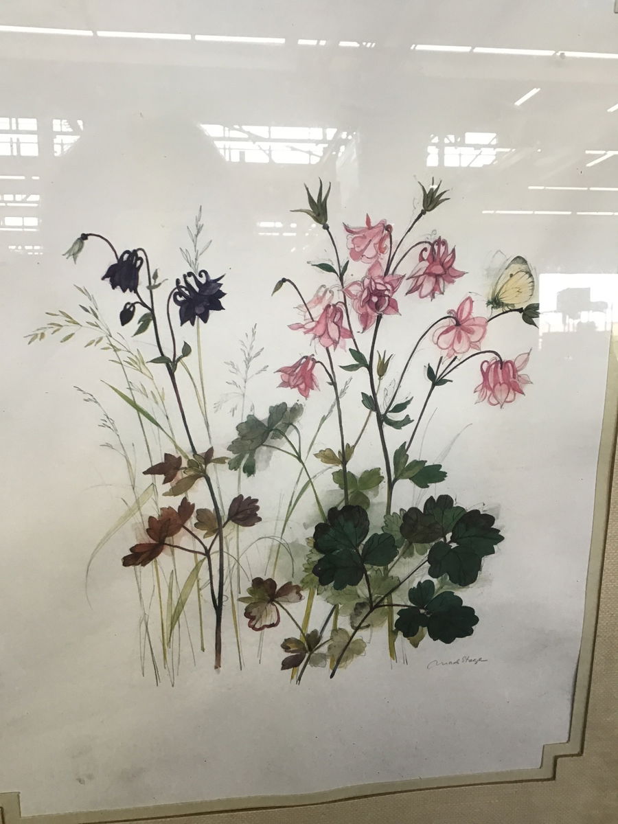 Vintage print of a lovely watercolor of some multicolor Columbines. Signed by Dutch painter Mads Stage on the bottom. Matted with some fun corner details for extra character.