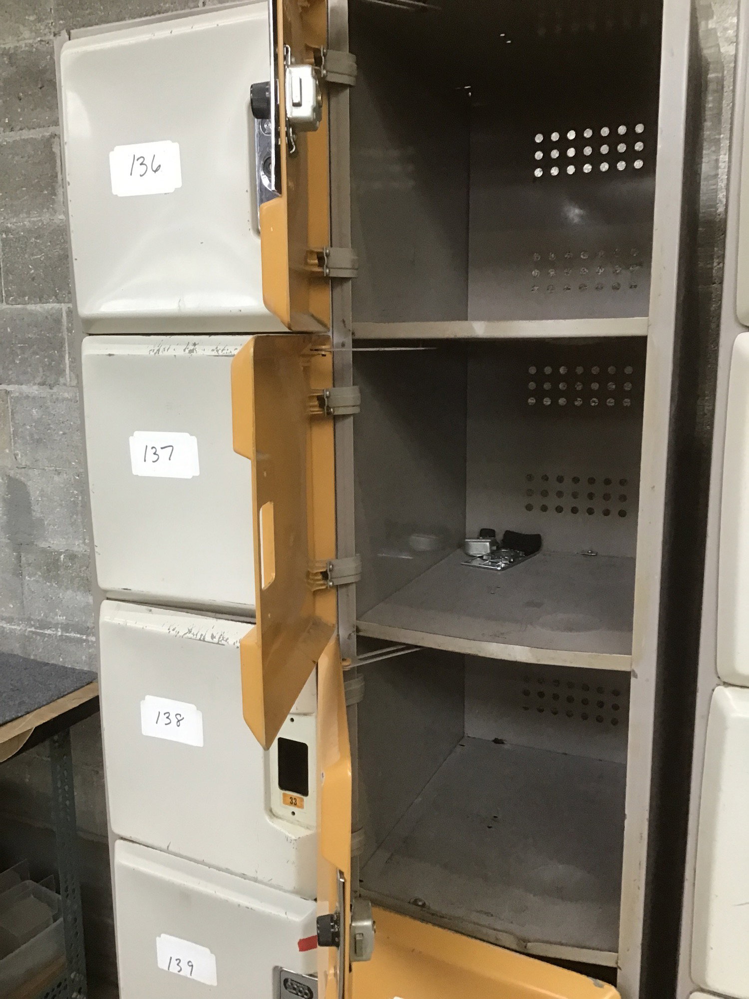 A groovy bay of 10 small lockers with combination locks (some are missing locks) in beige and mustard. These came to us from a local bowling alley! Photos may be representative.