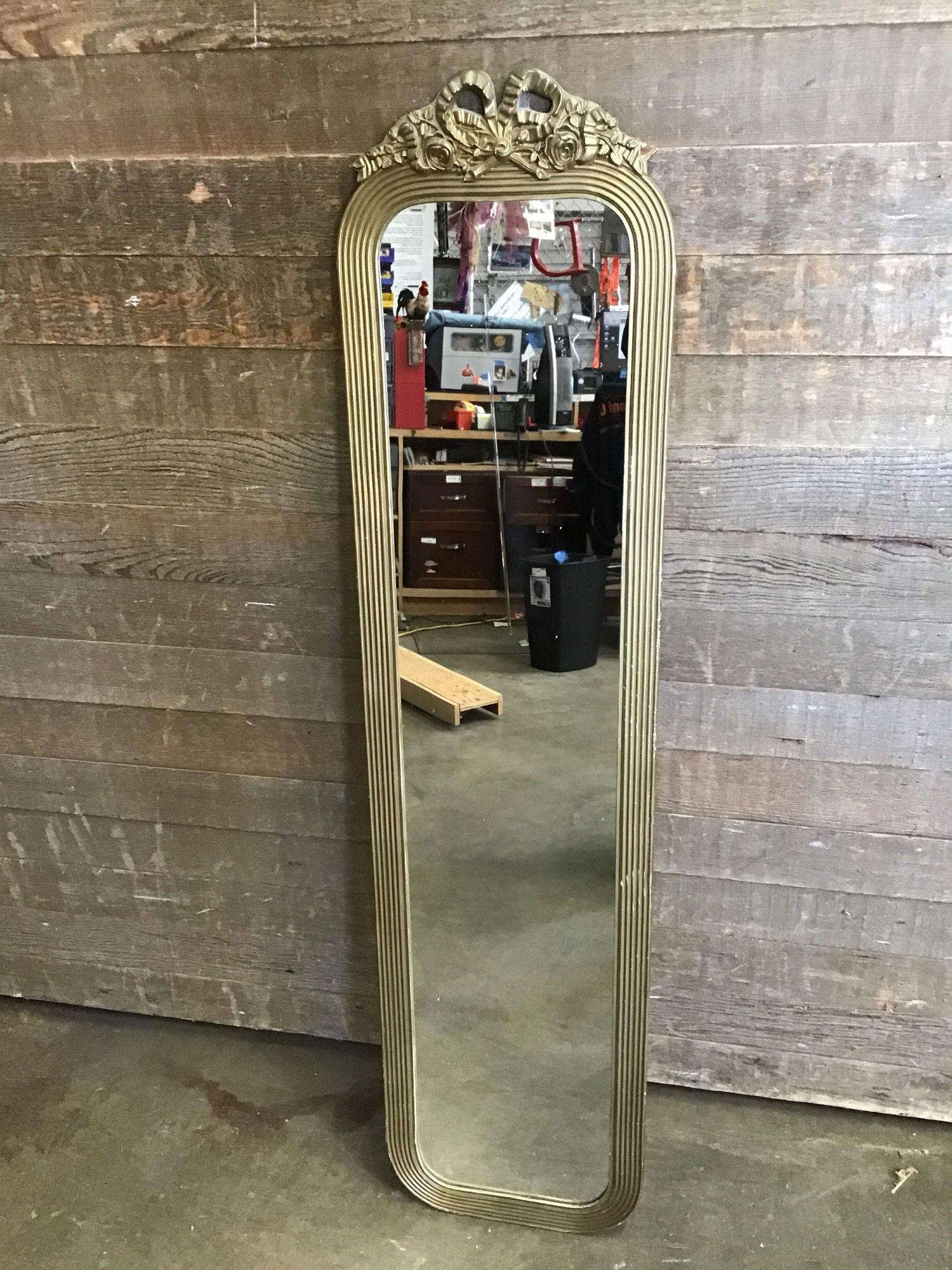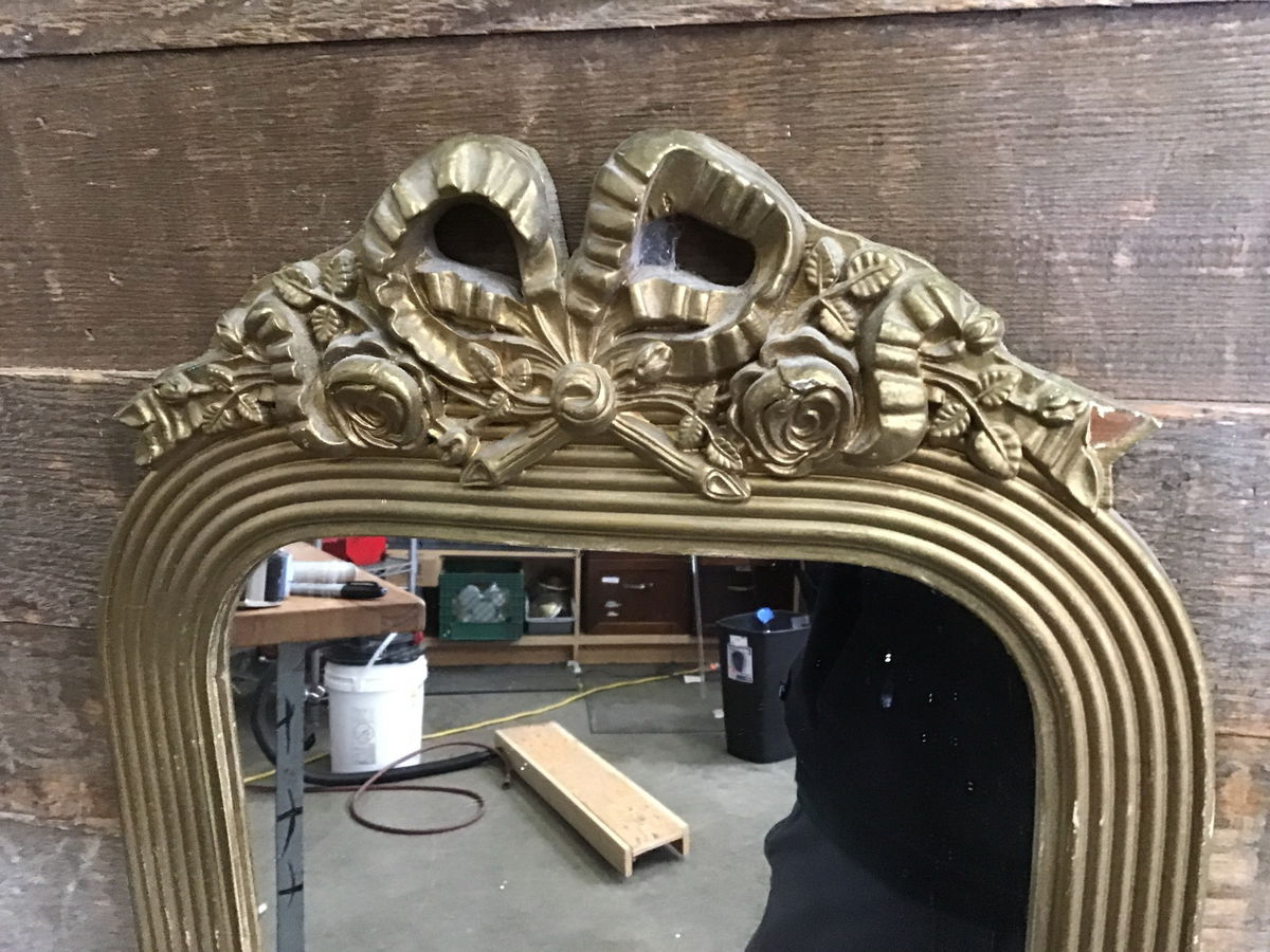 Pretty cute vintage mirror, the perfect size for a door. This mirror has a gold painted wood frame and a floral motif with bow at the top. Needs a good clean to remove some splatter, and there is a small smattering of desilvering happening in the center. Has wire on the back, ready to hang.
