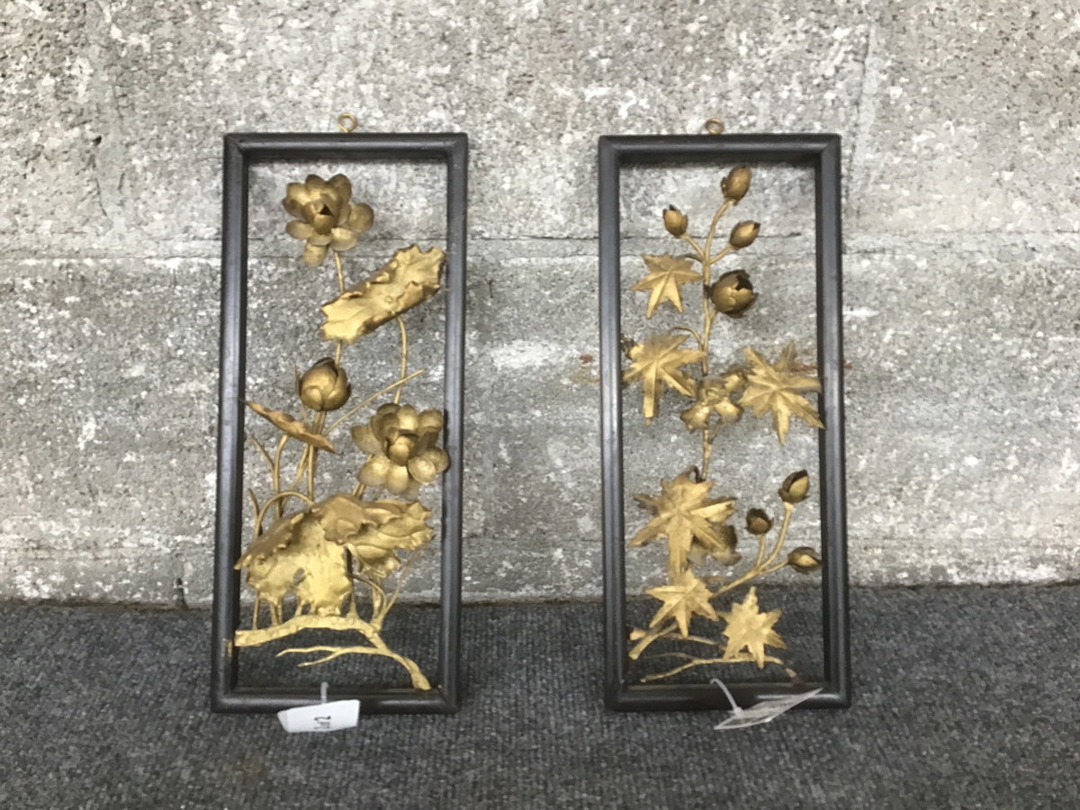 A pair of 3D botanical wall hangings with an antique brass finish and slim black "float" frames. One looks like lotus blooms and the other Japanese maple. Marked "China," probably made in the 1970s or 80s.