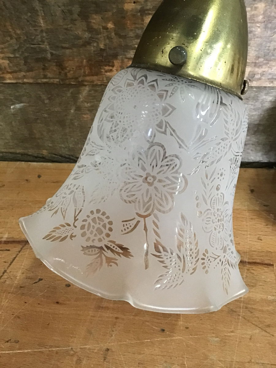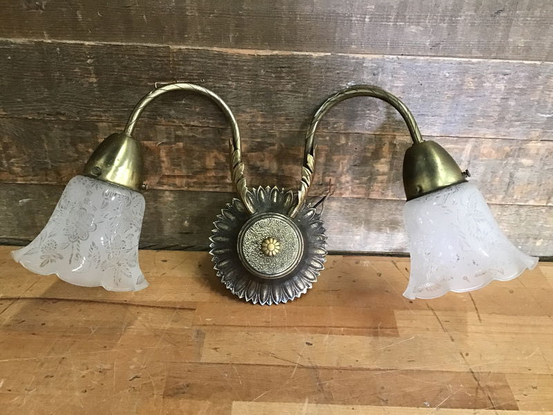 Beautiful vintage brass wall sconce by Moe Light, featuring a sunflower bracket that branches into two bulbs with etched floral glass shades. Unsure if shades are vintage or reproductions, but they're in great shape. Looks to have been rewired at some point in its life and still looks good, though we always recommend a full test prior to installation.