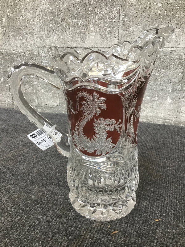 This rather regal lead crystal water pitcher was made in the 1950s for Hofbauer of West Germany. The decorative patterns on this pitcher are quite unusual and attractive, exhibiting the midcentury fascination with Asian ornament. The stars, of course, are the 3 intricate, curling dragons highlighted with sanguinous red flashing! It's in overall excellent condition, with no flaws that I can discern. This would be a great find for collectors of West German goods, fantasy/dragon enthusiasts, Asian-inspired decor, or crystal collectors looking for a truly unusual and hard to find piece!