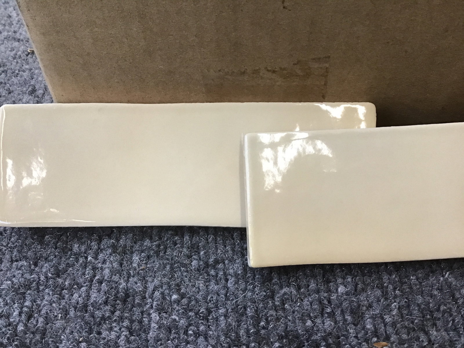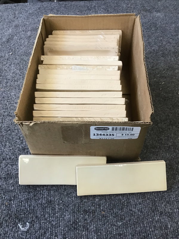 A small box of 2x6 glazed ceramic tiles made by Horus Art Ceramiche, stamped "made in EU". The glaze is a glossy sand color. There are about 44 tiles in the box - not sure how many square feet, but looks like enough for a small backsplash or border.
