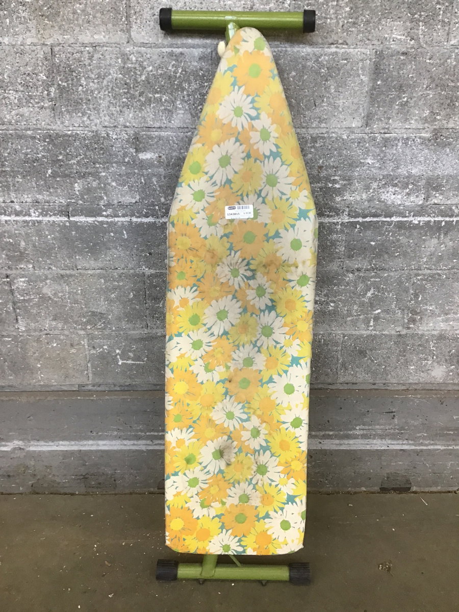 Vintage Ironing Board painted a pale green and has a vintage floral pattern fabric cover.