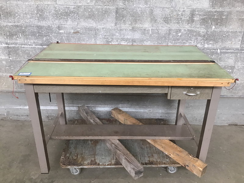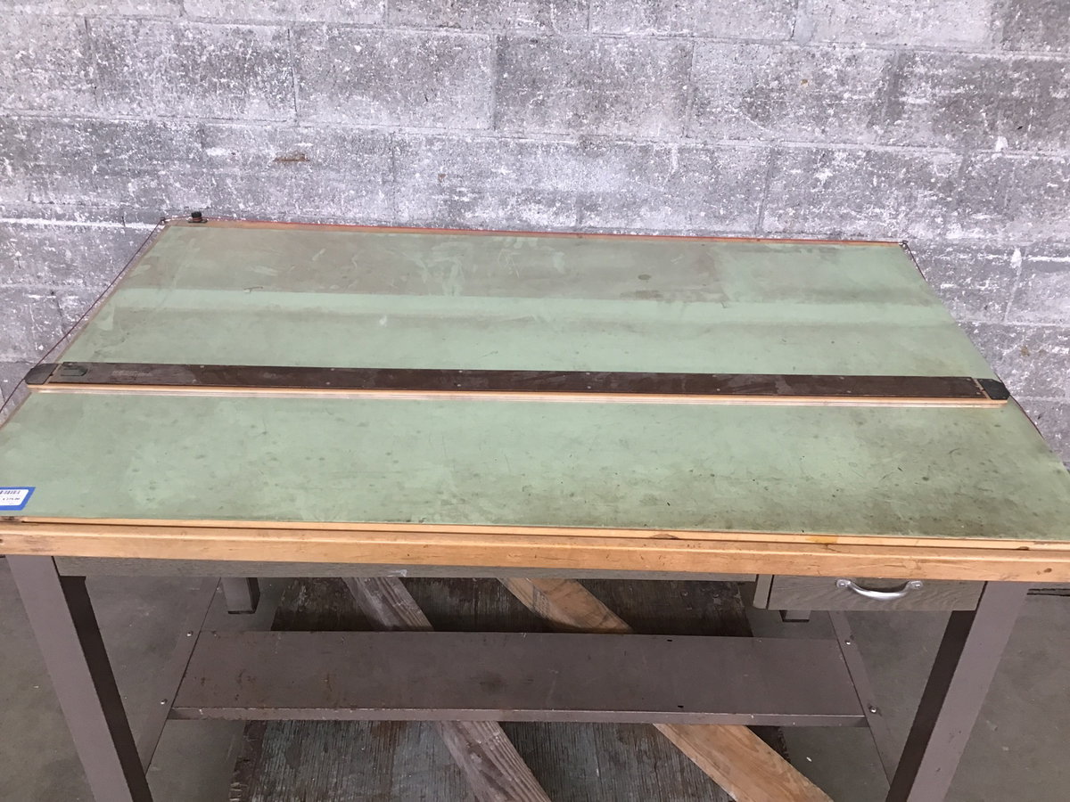 A vintage drafting table/desk with two deep drawers for supply and work storage. Also includes what looks to be a fully attached drafting parallel straight edge. This drafting desk radiates severe precision and sharp work ethic. Great for anyone looking to get some serious drafting good and done!