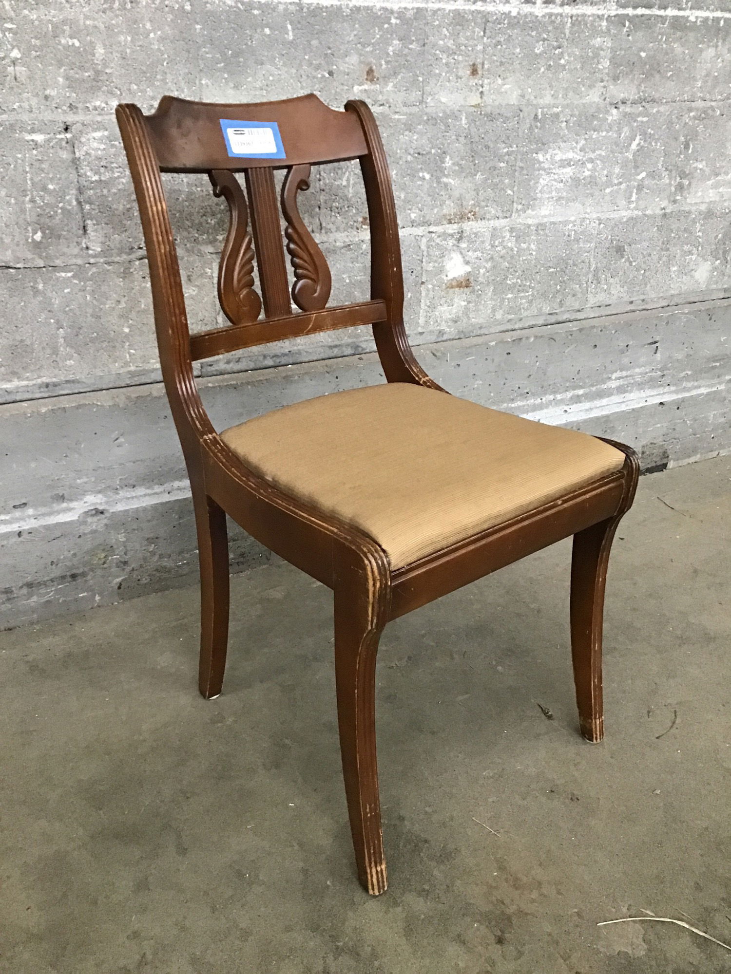 This is a vintage mahogany chair in the Duncan Phyfe style with the signature lyre back splat. Upholstery looks fine for its age.