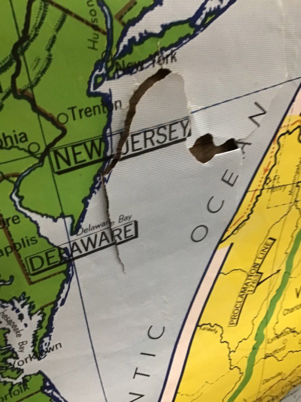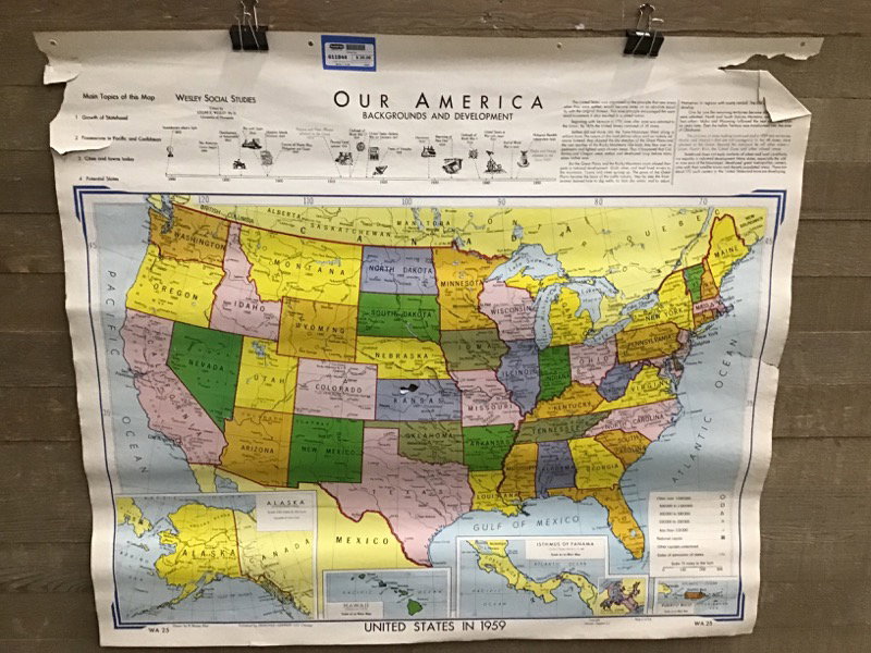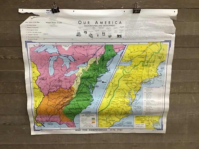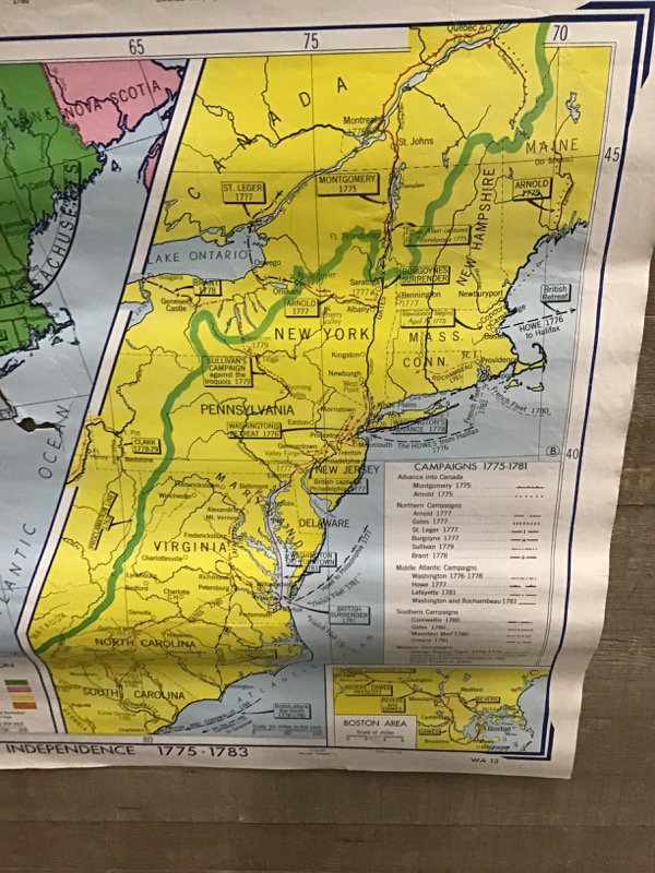 Vintage, linen style, double sided map with the subjects of War for Independence 1775-783 on one side and United States in 1959 on the other. Has nice color, but unfortunately a puncture near the middle, another tear on an edge, and possibly other small blemishes. This one is being sold as a loose unit with no hanger. Price reflects condition. Believe this map was made just after 1965.