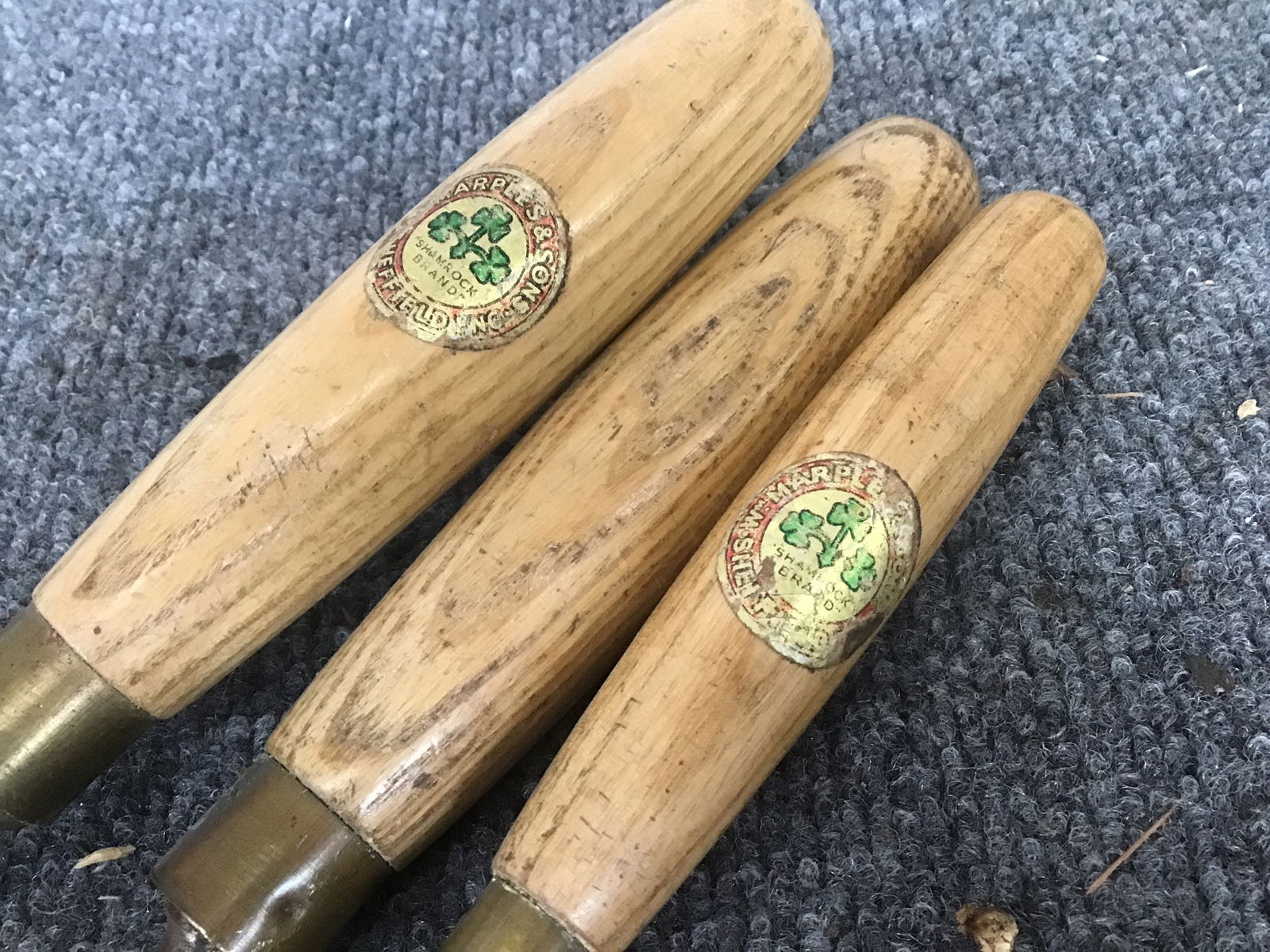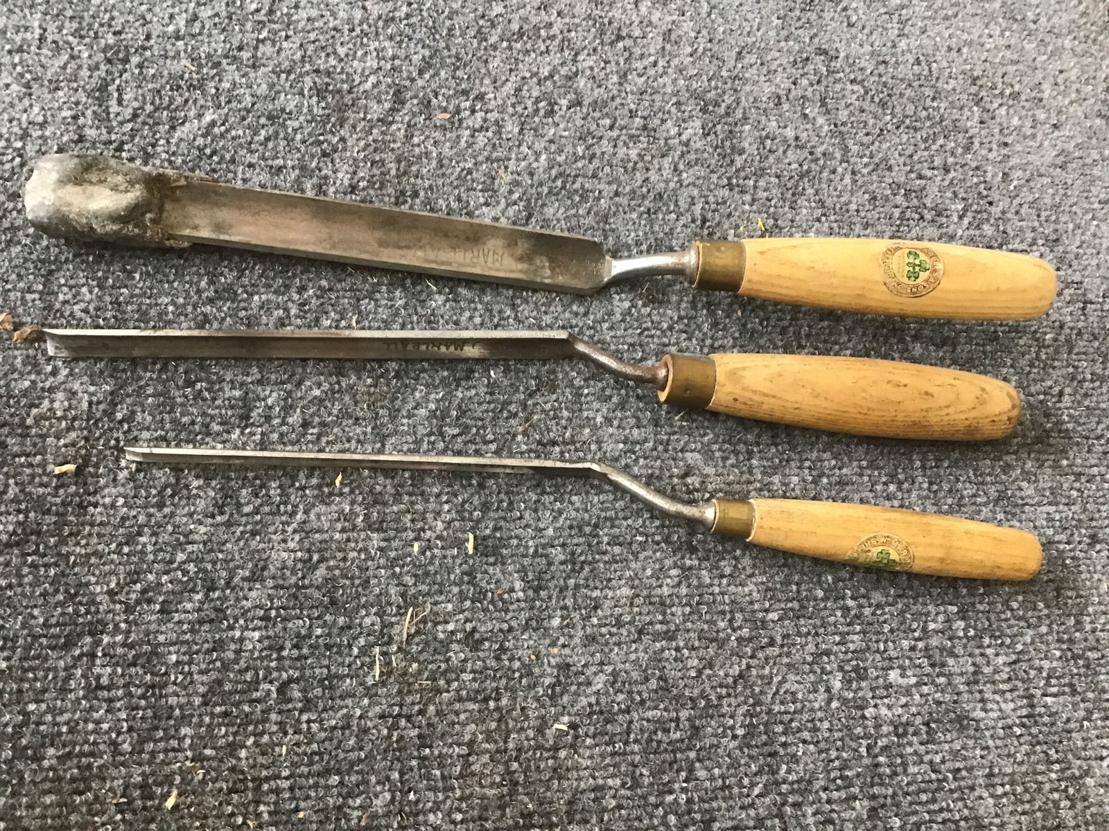 Set of three vintage Marple & Sons crank neck gouge chisels. Made in Sheffield England. Edges are are all in good shape with one still waxed. A 1", .5" and .25".