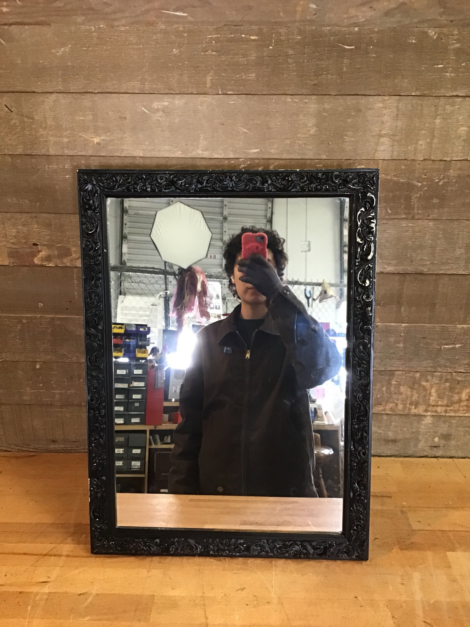 Small vintage medicine cab with ornate frame. Made of plastic all around. Wall mounted. Includes 2 glass shelves. No damage to glass.