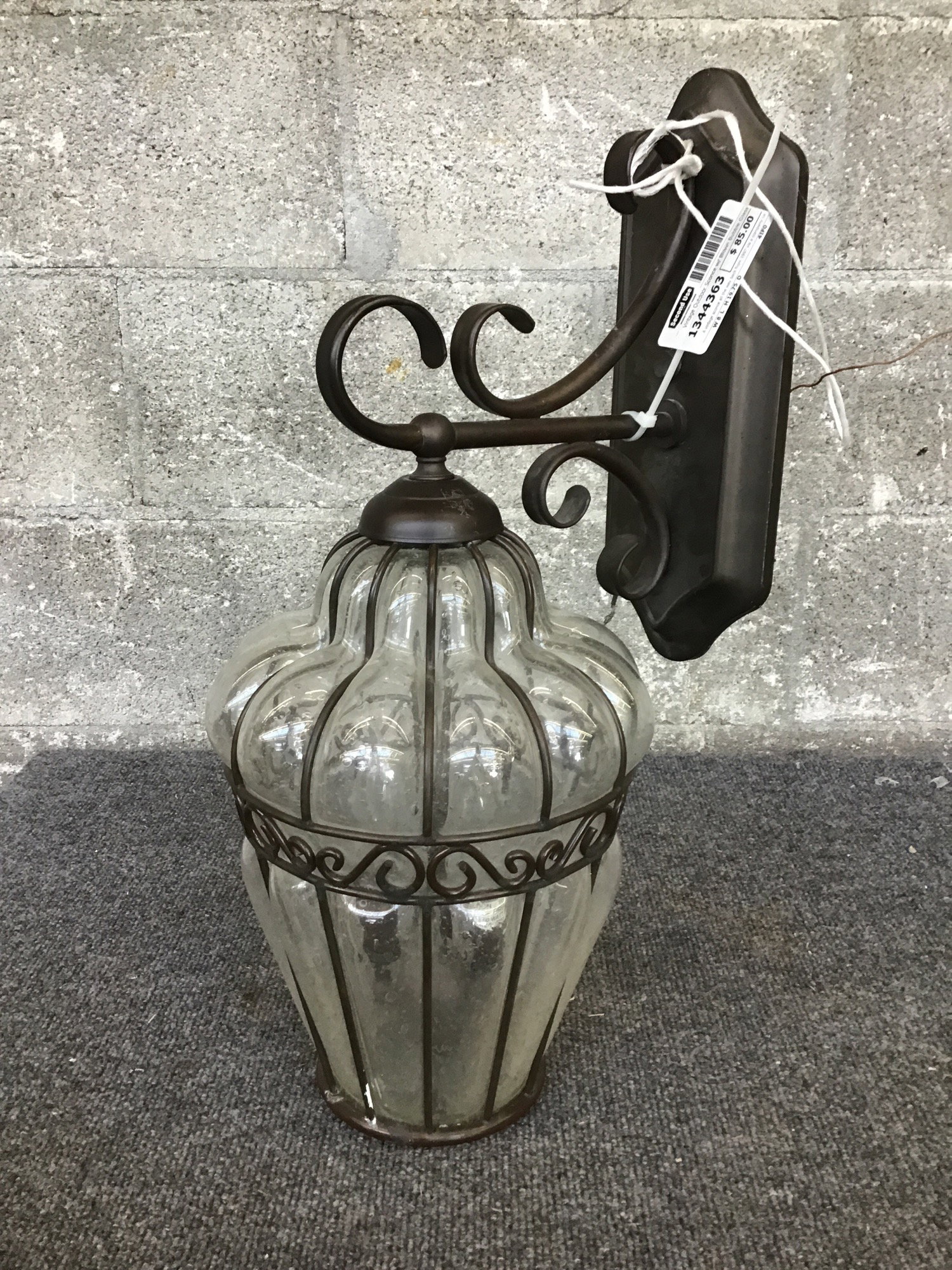 A vintage sconce all the way back from 1997 via a company called 'Solid Brass' that is suitable for wet locations. This sconce features a large frame, a fixed blown glass shade with a delightful bubbly texture within the glass shade. This would make for a good statement entrance sconce.