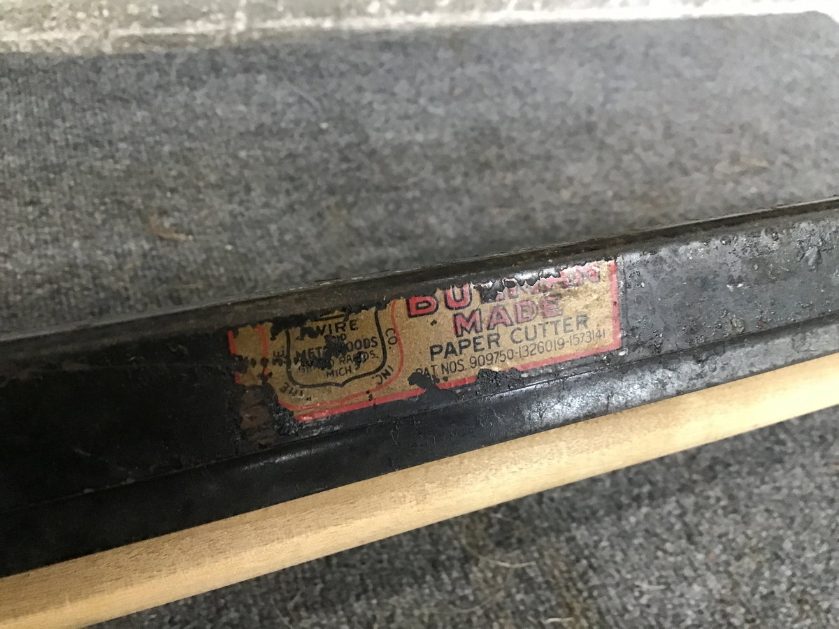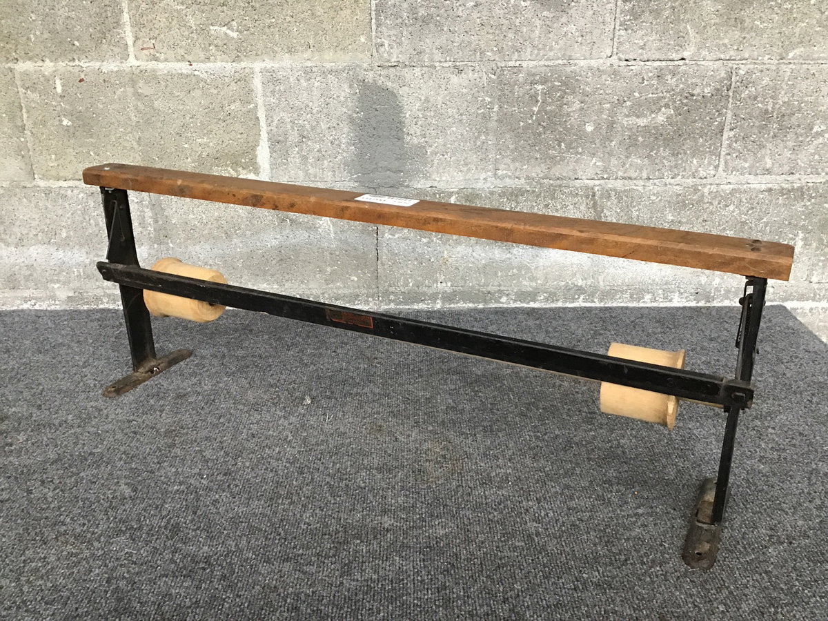 Vintage Paper Roll Dispenser with a wood spool and holders on a steel frame and also includes a spring loaded steel cutting blade for even cutting of paper. Has mounting brackets at the bottom.