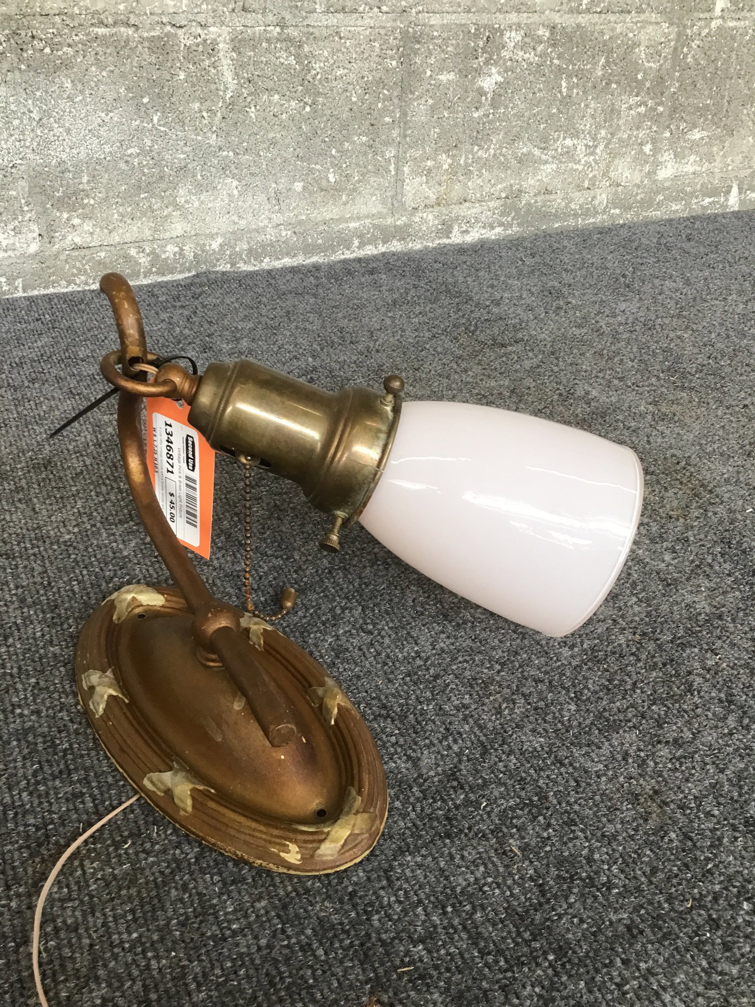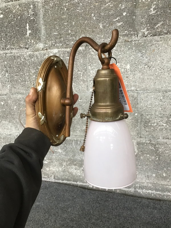 A cute little vintage sconce with a brassy canopy and a glass fitter around the bulb that's a little bit pink? Cute and classy!