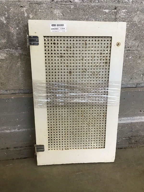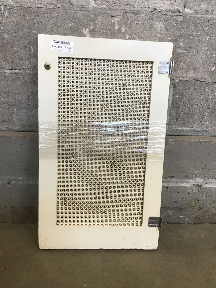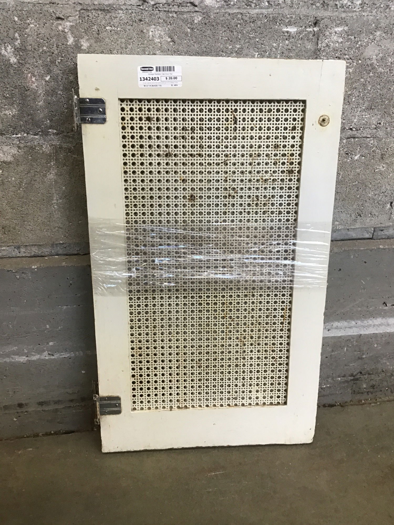 A pair cabinet doors that were once part of a radiator cover, now detached. They feature wood construction with an ornate grate, all painted a slight off-white.