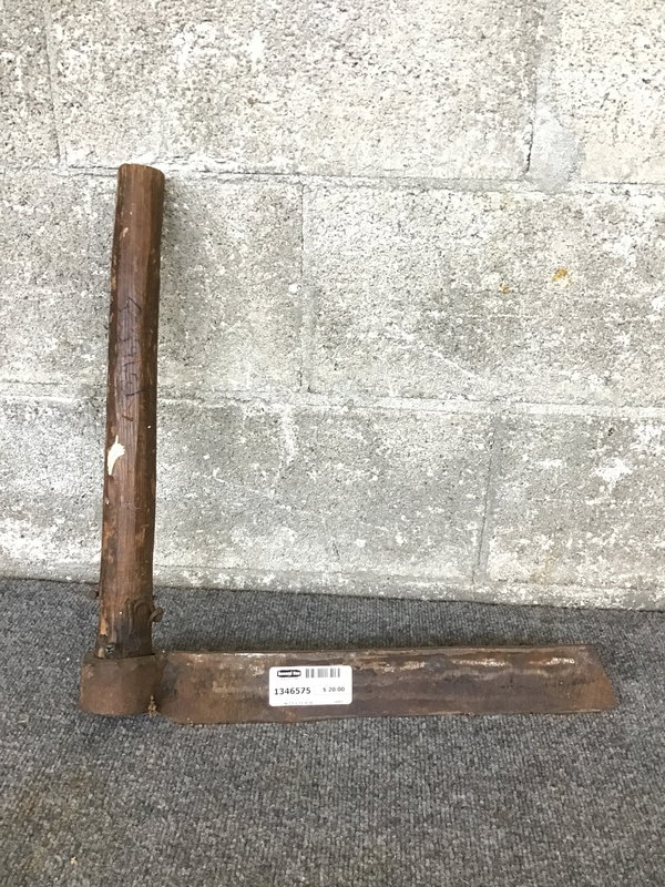 Shingle Froe with wooden handle. Blade has some rust, but is still very thick. Wooden handle feels homemade but is sanded and oiled well. Handle has some scratches and based on the nails and screws near the blade it looks like there might be some issues with the blade running up during use