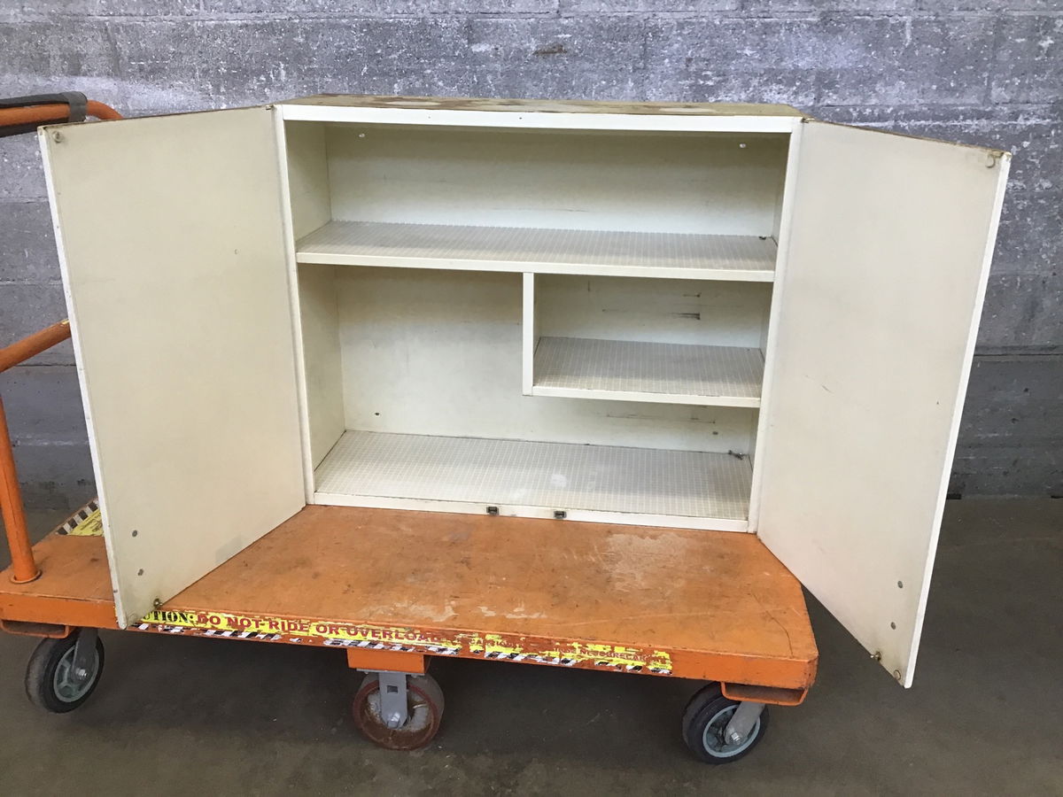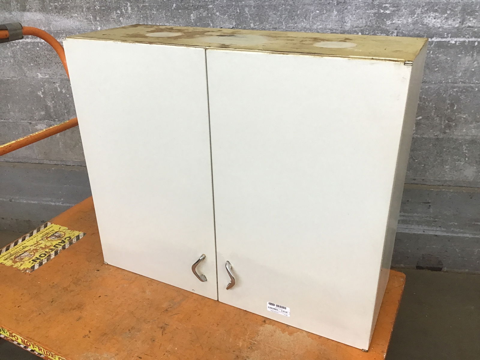 A well-weathered upper shop cabinet that's got a bit of a midcentury charm and two fixed-height shelves inside. It's in good shape but could use some cosmetic work.
