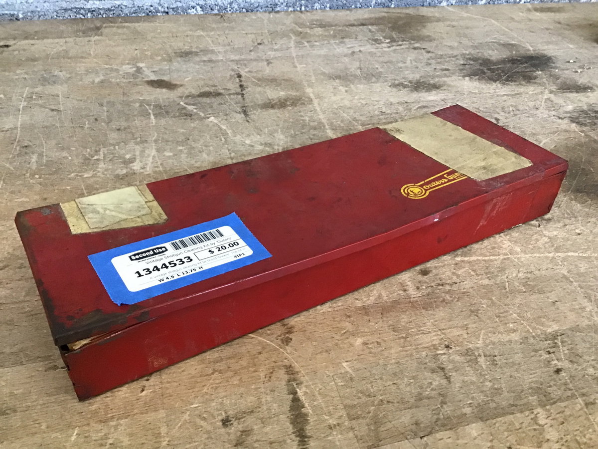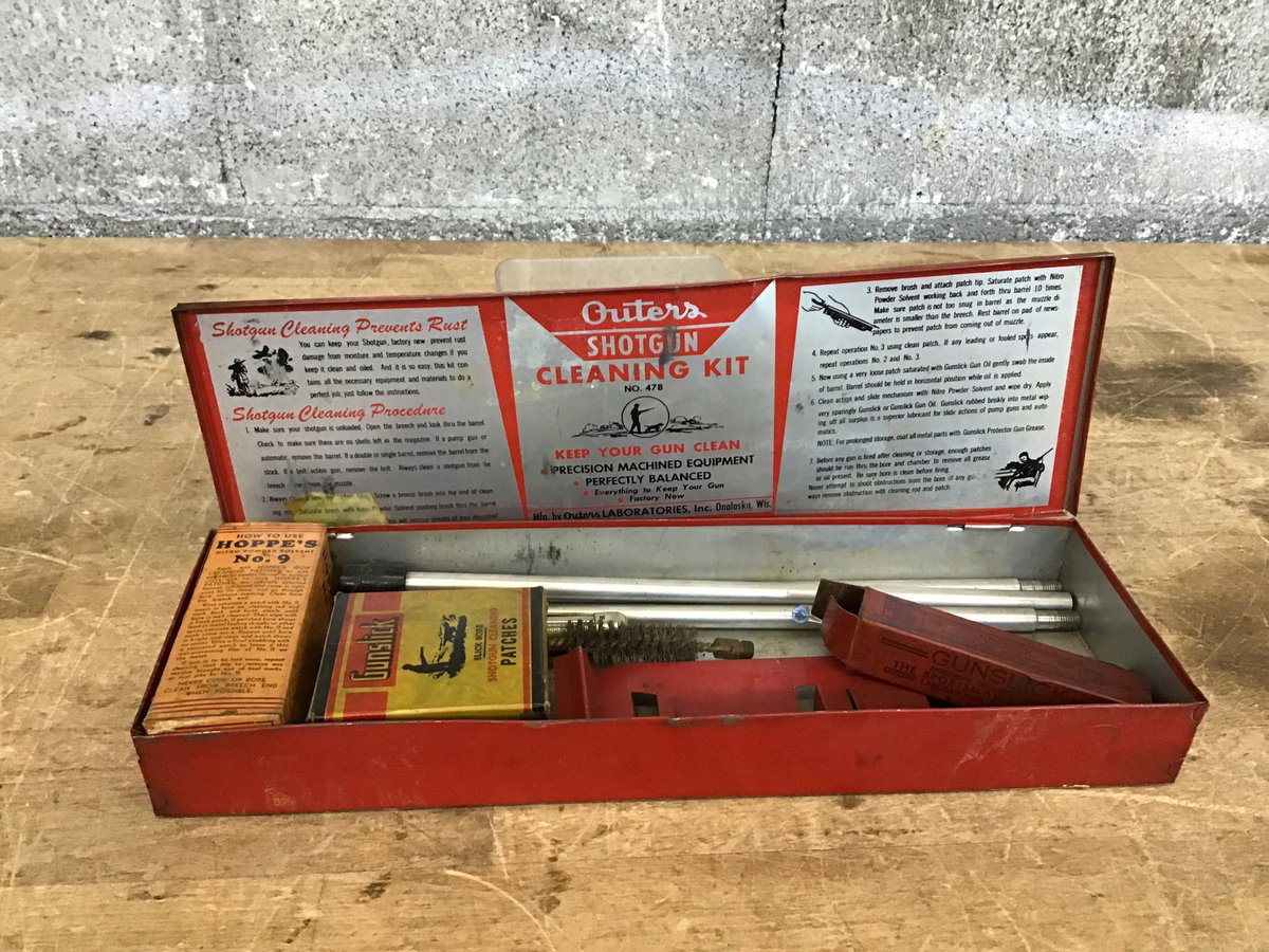 A vintage shotgun cleaning kit by brand 'Outers'. The kit includes nitro powder solvent, gun patches, 'gunslick', cleaning rod w/ attachments and a red case with instructions. This would make for an interesting gift for the hunter in your life.