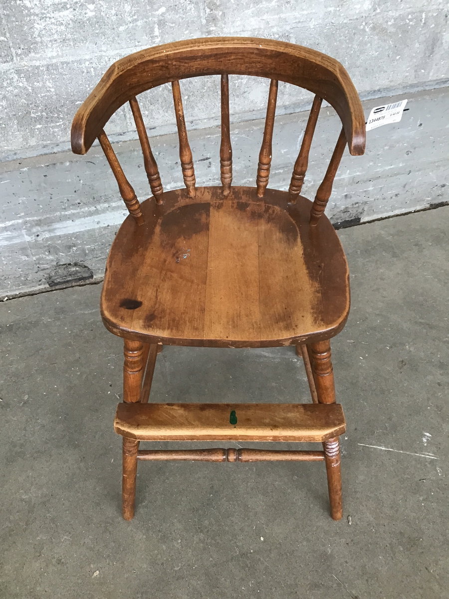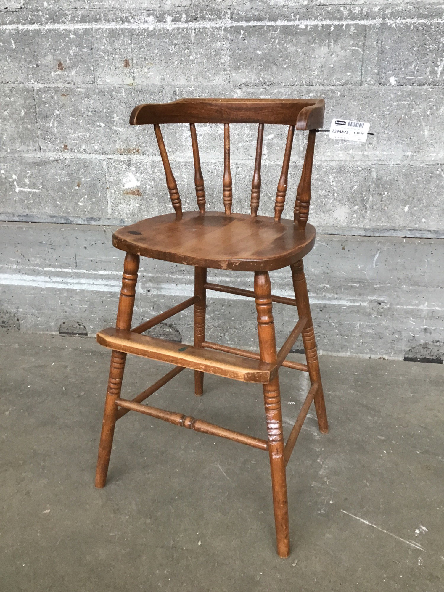 A vintage solid oak high chair with a foot rest and a curved back support. No tray attached, but this would also make good for a plant stand or even as a pedestal for a kitty bed.