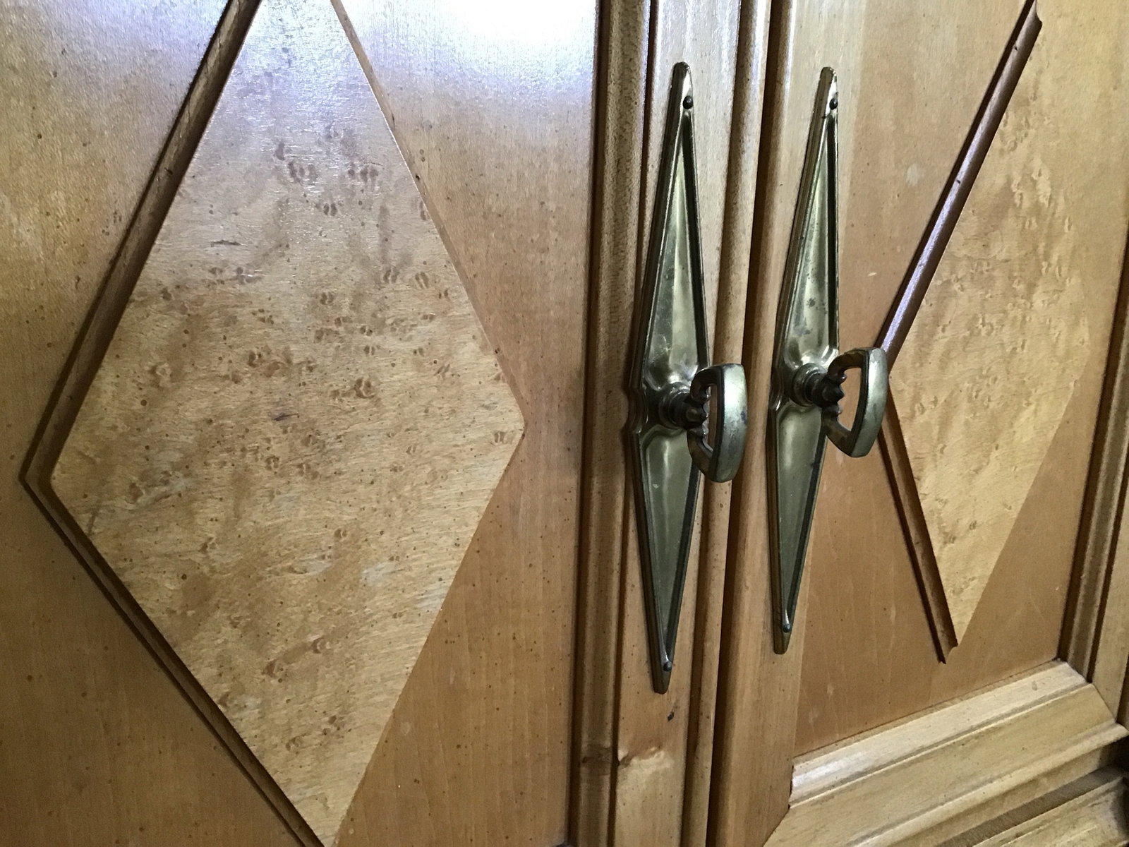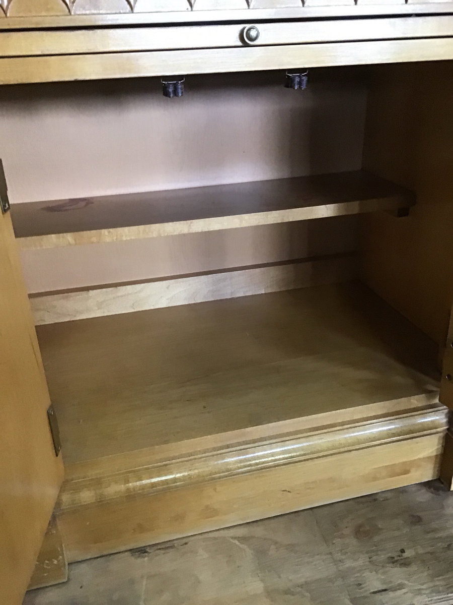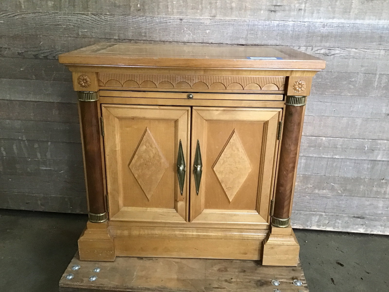 Stunning vintage Stanley Furniture "Capri" nightstand! Constructed of maple, mahogany and burlwood. Features diamond wood accents, brass pulls, scalloped trim and carved wood floral details. All adding to that art deco Hollywood charm. Only damage to note is on its top that will be pictured. Easy fix for the right person. This piece is in wonderful condition otherwise.