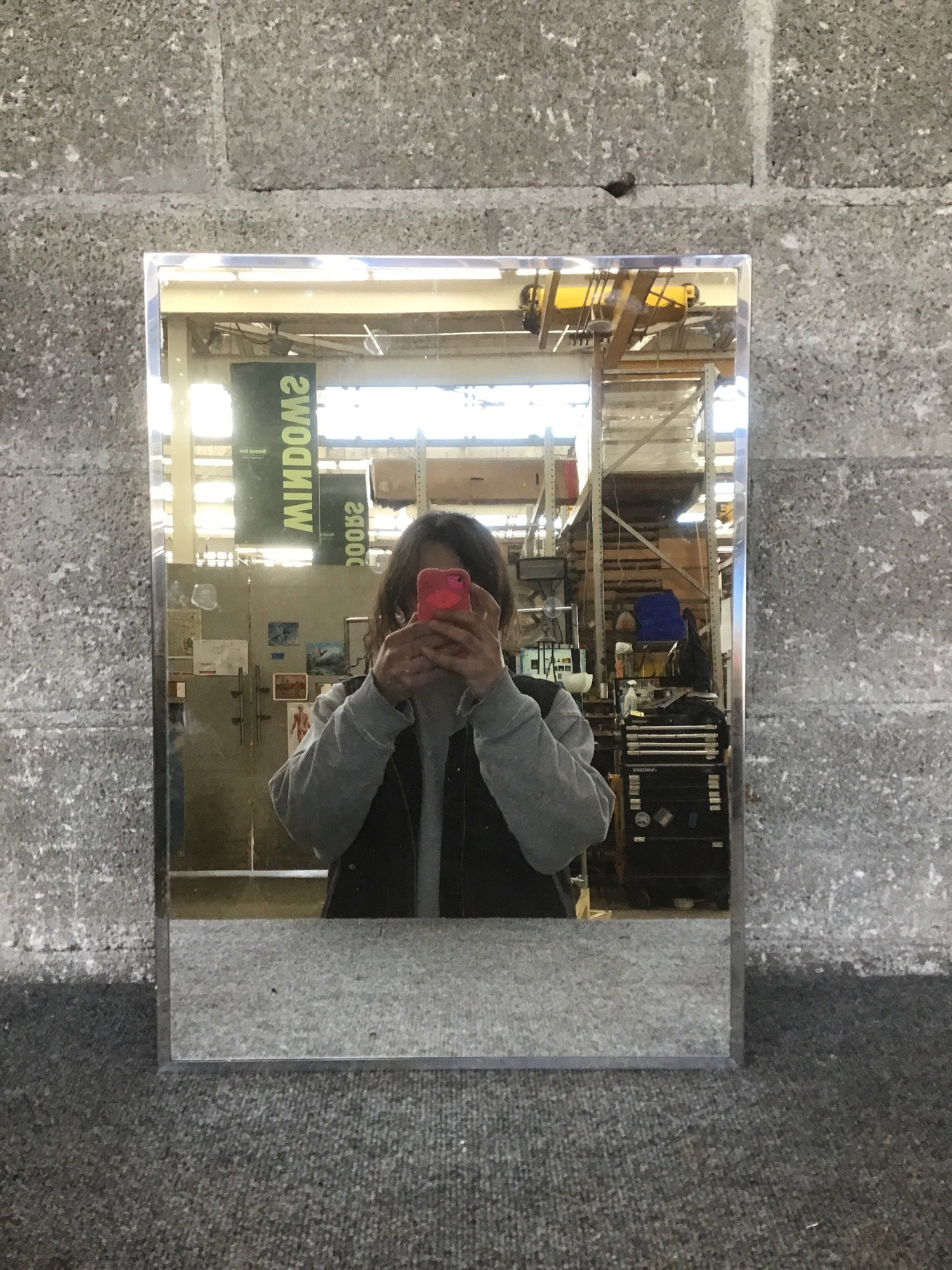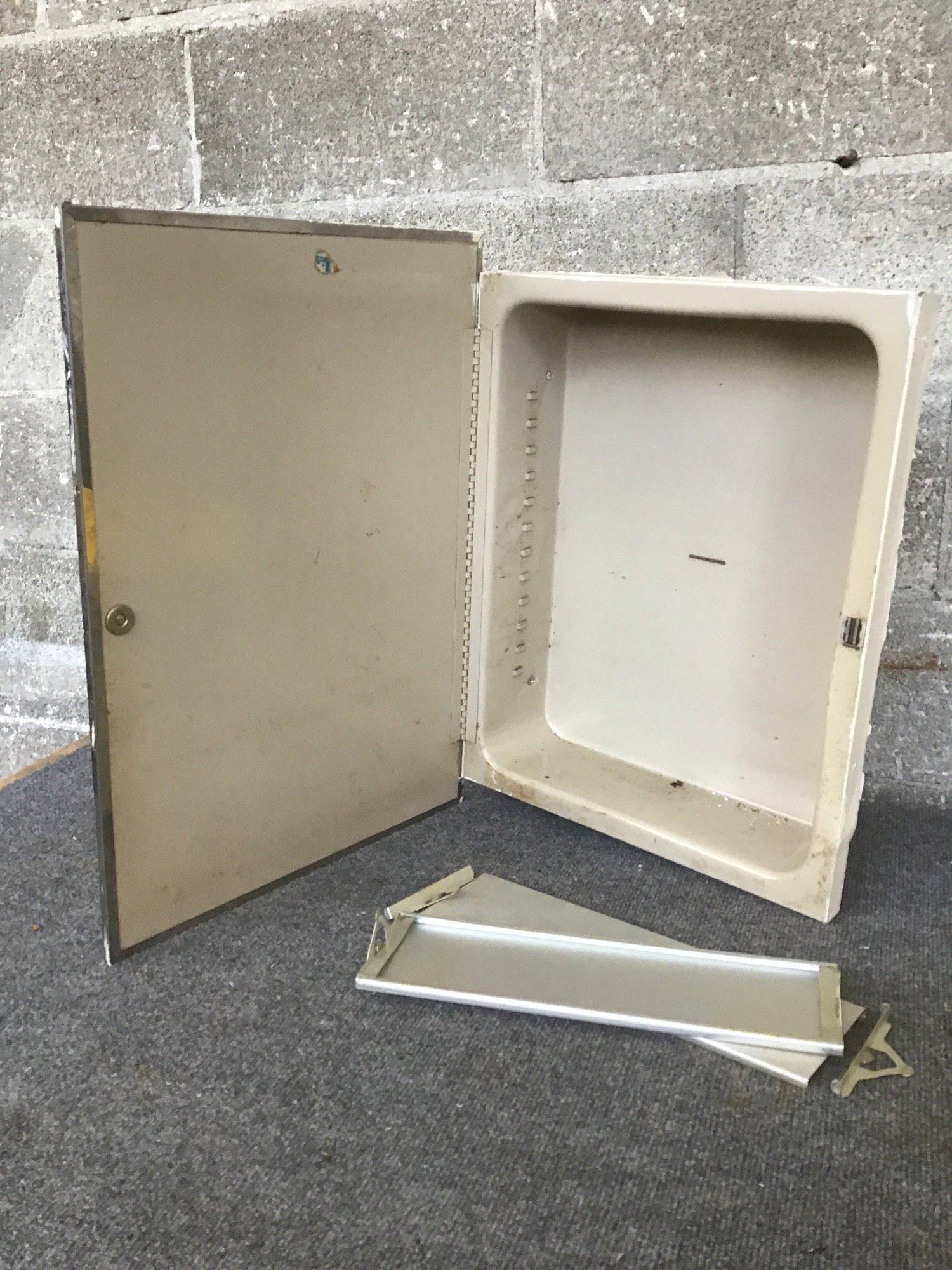 Vintage steel medicine cabinet with shelves.
