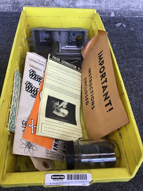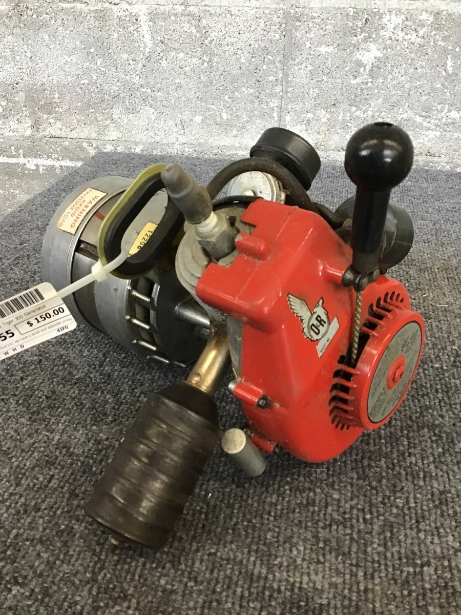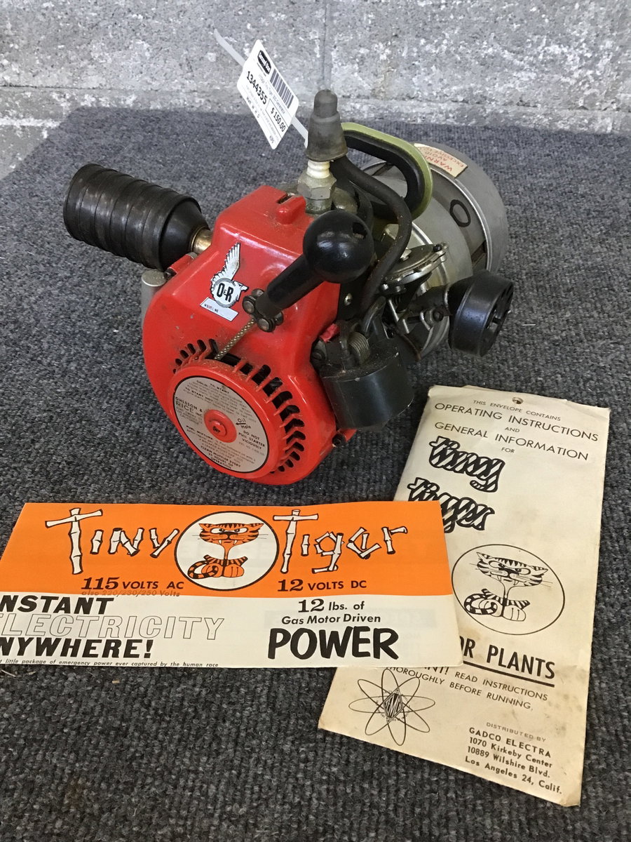 From Ohlsson & Rice Inc. we have a small and adorable vintage generator called 'Tiny Tiger' Model 300. Seems to operate on a combination of oil and gas. Rip cord seems to be operational. Untested in house buy it does come with a few pieces of paper, manuels and some misc hardware.