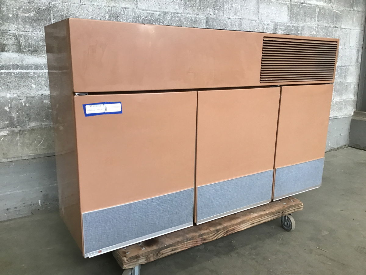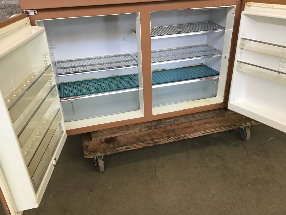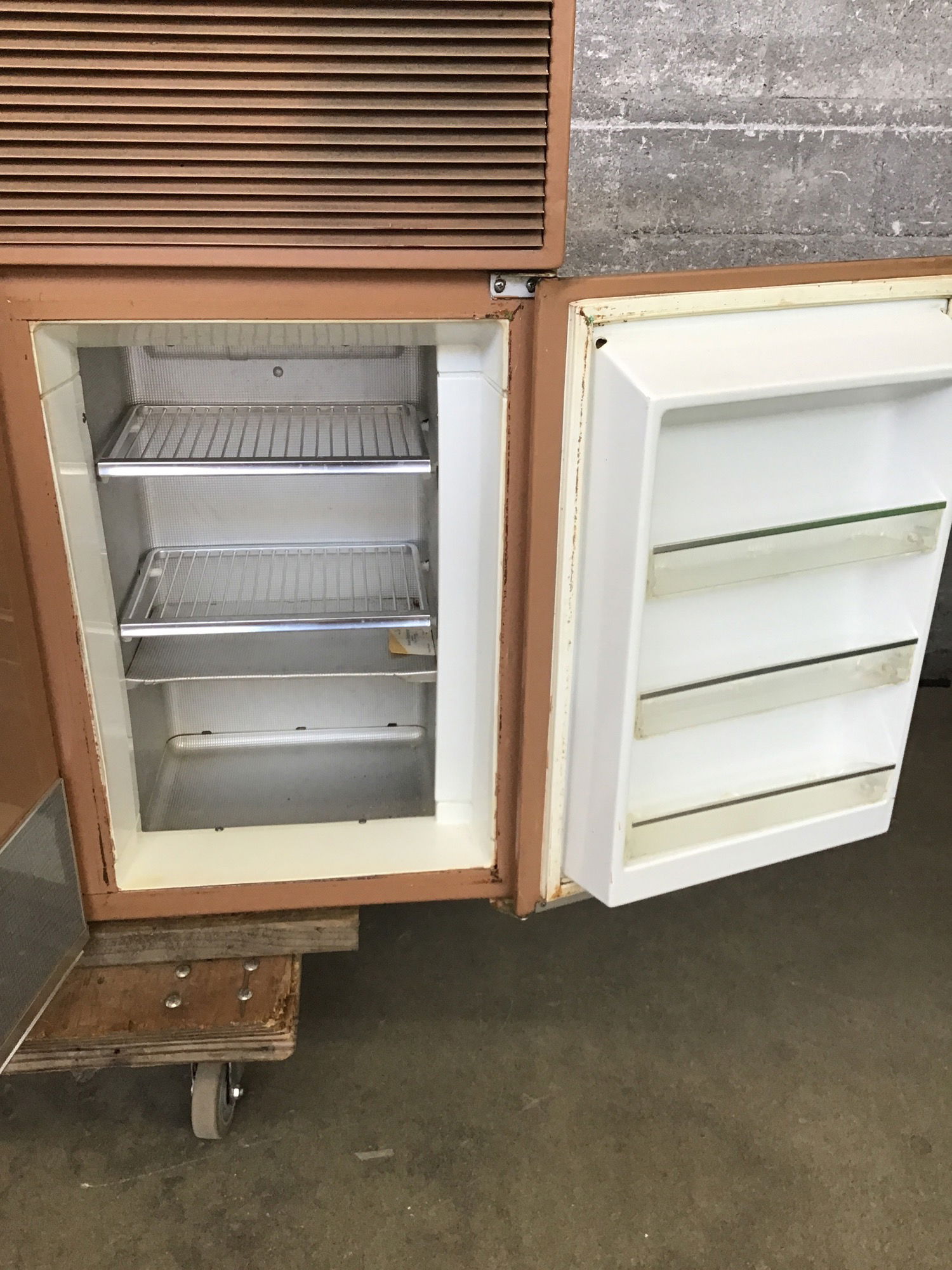 What a glorious piece of history! This GE made wall mount refrigerator is from the late 50's/early 60's and is in stunning condition, having been recently pulled from a MCM home by our talented crew. It's a desert taupe color, a cousin of desert rose, with blue front trim panels. Although we were told the compressor "should" work, we're selling as inoperable as this unit has been off and used for many years as dry storage. The left two doors are refrigeration and the right is a freezer. The compressor is housed above everything and there is a mounting bracket that is included to make install a breeze. Cosmetically it is in excellent shape, free of damage and sporting all of the original aluminum trim. Toss in a new compressor before install and you'll have a well made appliance that's ready to keep on running for another half a century. 18" deep. Oh and check out this article we found with more information about these specific wall mount fridges.