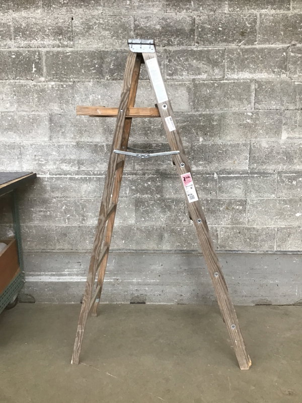 A vintage wooden step ladder with a small shelf at the top. The shelf looks like it will need to get nailed in but this is a simple fix. We would advise you to use at your own risk!