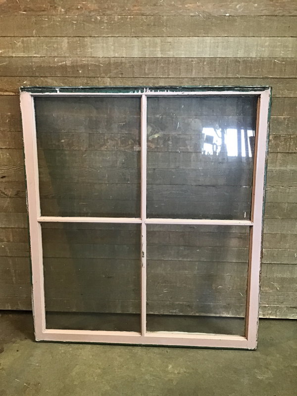Vintage wood window sash in fair condition. One side is painted green and pink on the other.