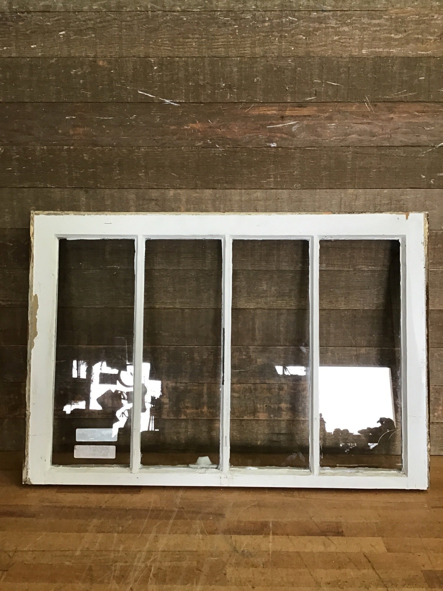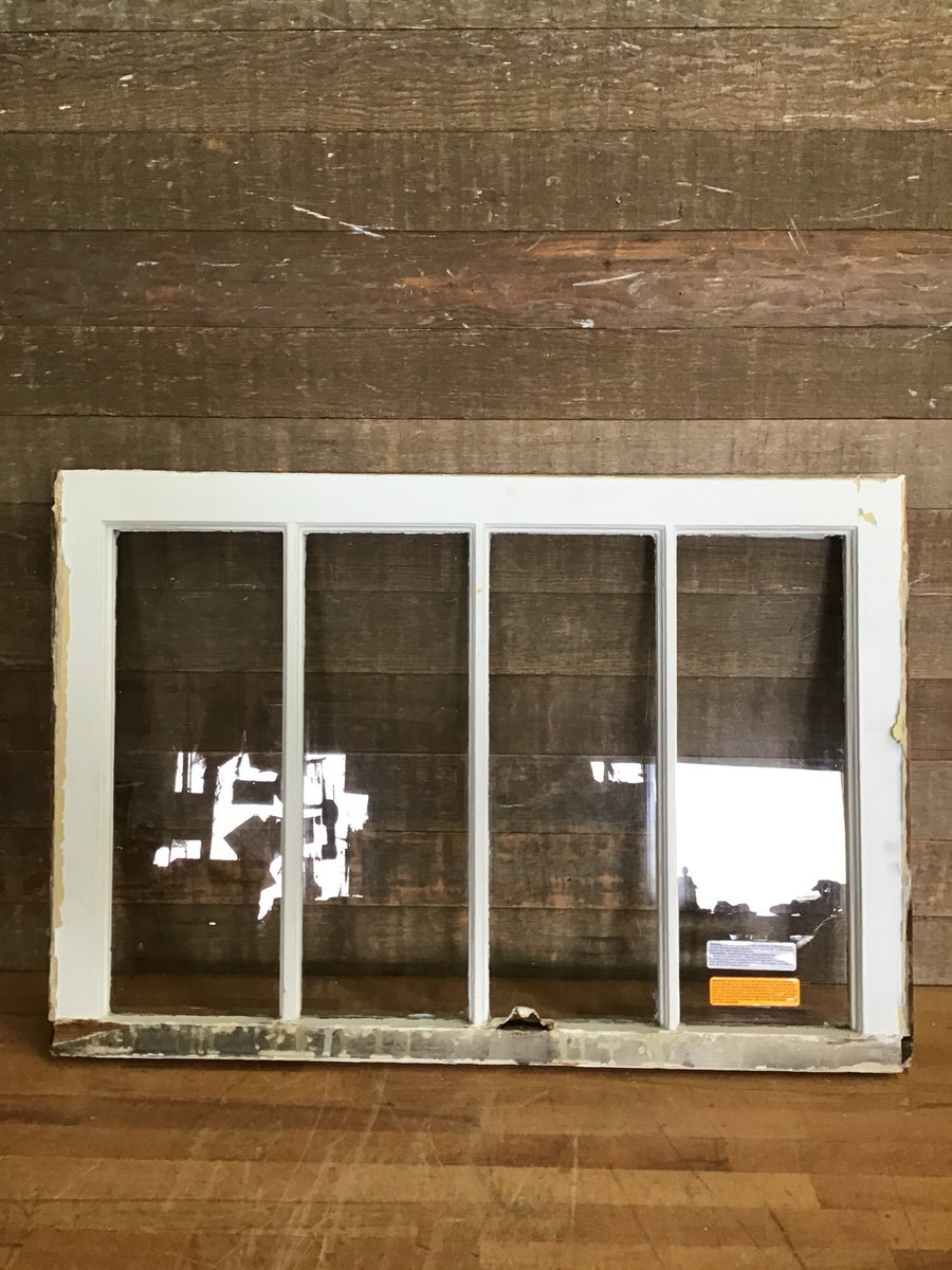 Vintage wood window sash with four panes of wavy glass. Great for DIY projects like cold frames, green houses, or hanging partitions.