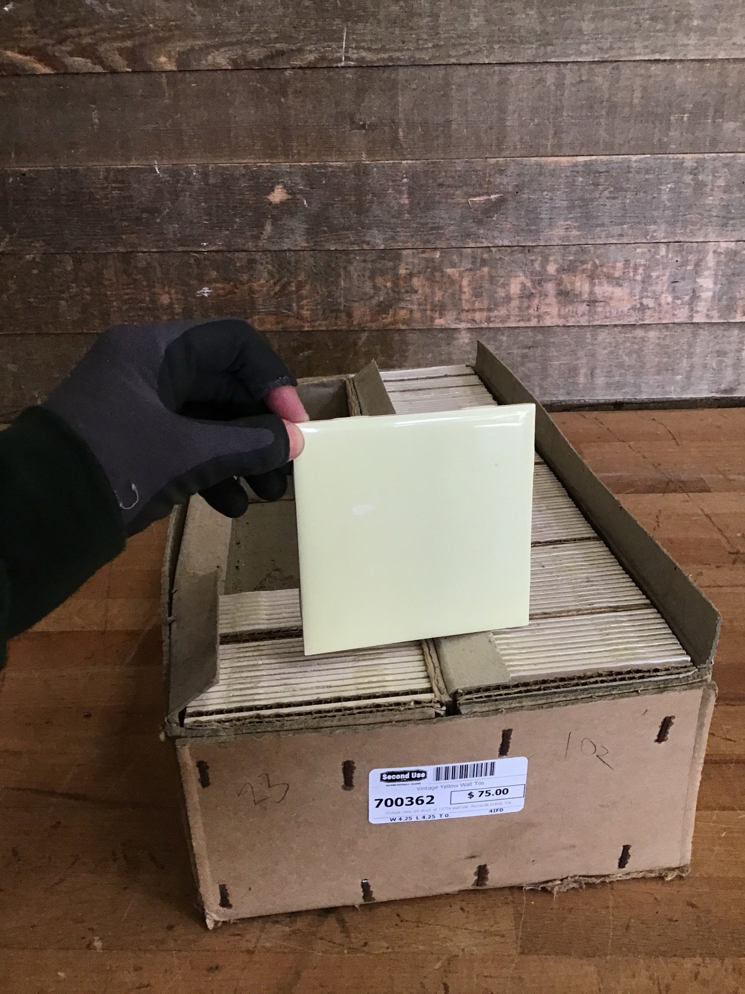 Vintage new old stock of 1970s wall tile. Richard's brand, made in England. This box has 127 pastel yellow 4.25" x 4.25" tiles for approximately 15.5 square footage. Great for making a little back splash or vanity countertop.