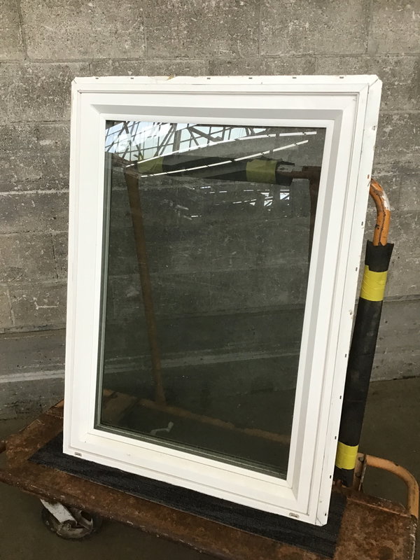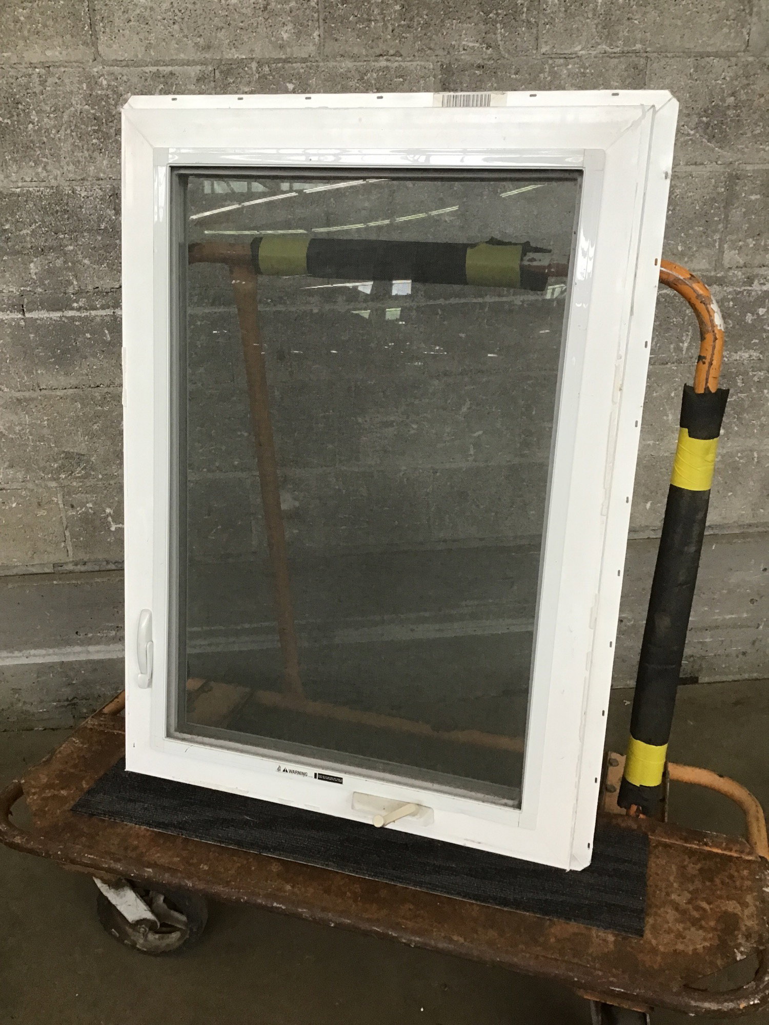 Ca. 2003 White vinyl casement window that I think should meet egress requirements for ground floor use, but check local building code first.