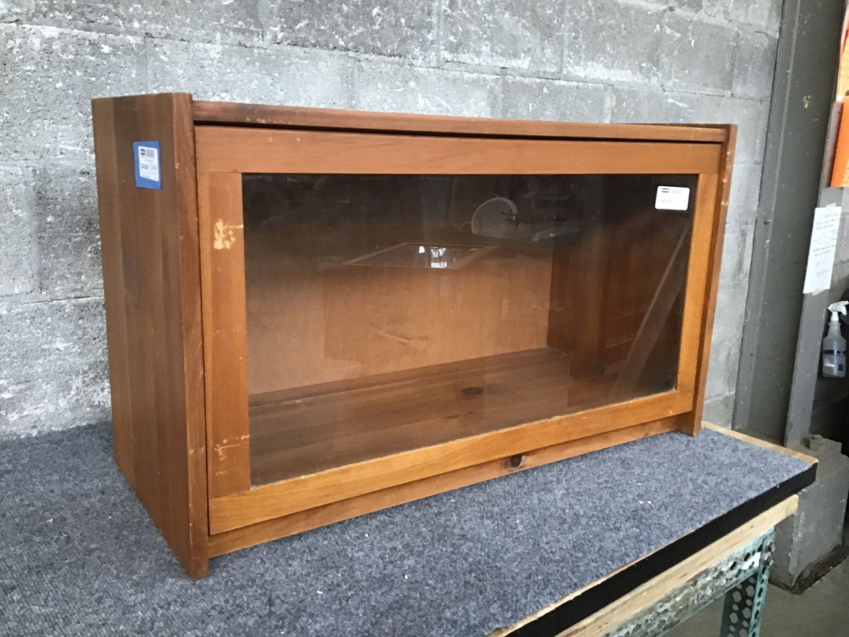 Replace your milk crates for this solid wood record storage bench. The glass door tilts up and stores away inside like a barrister cabinet but is sturdy enough to sit on. Cosmetically it has some scratches and scuffs but is structurally sound. Add a pad and you've got a great versatile storage bench.