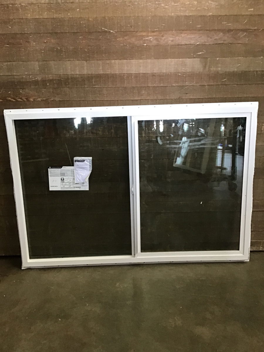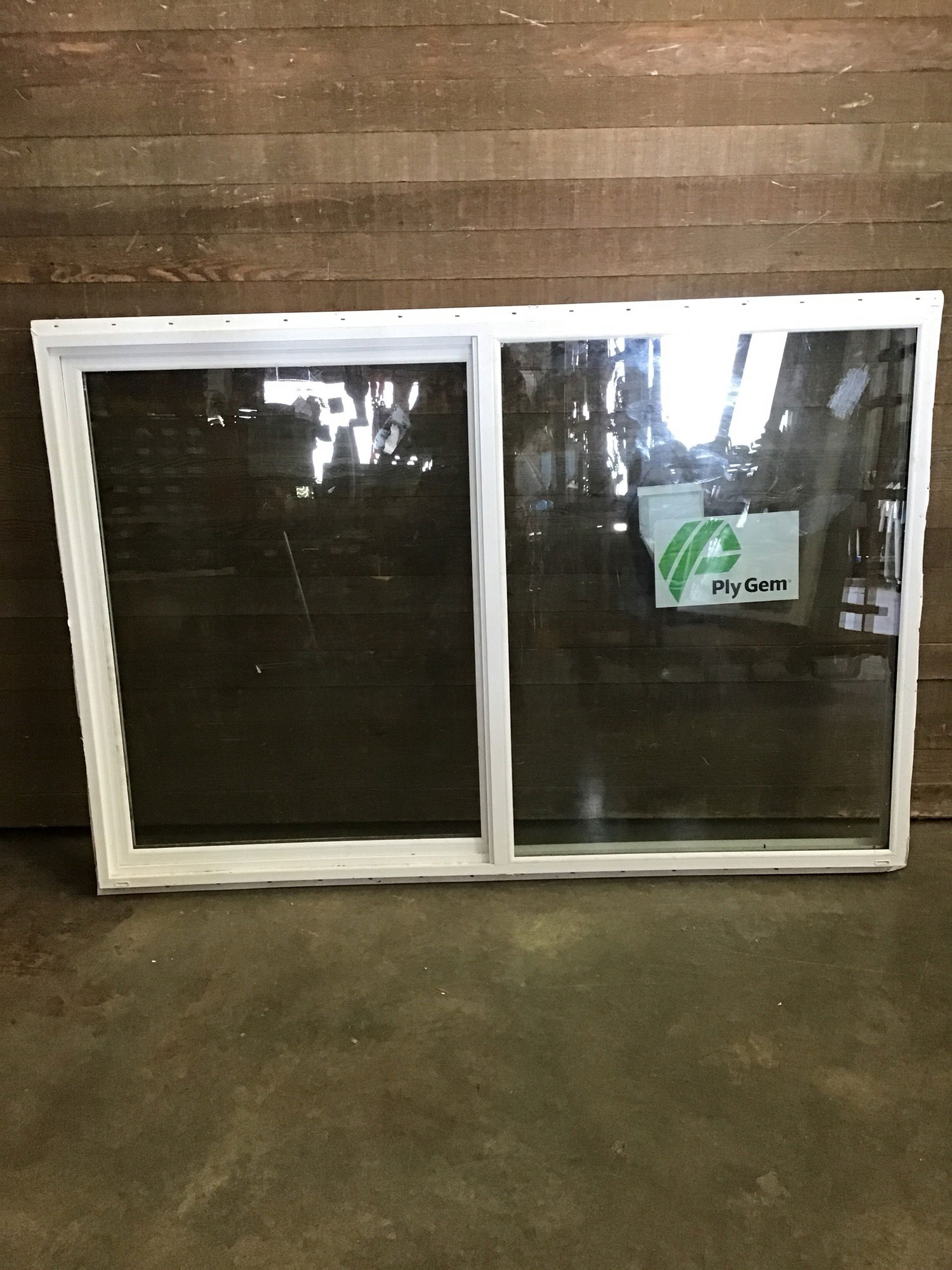 Large Ply Gem vinyl slider window. 71.5" W x 47.5" H. Installed but removed. Vinyl fins are still mostly intact. Window slides and locks up nicely. Still has energy tags on it, low-e and argon filled.