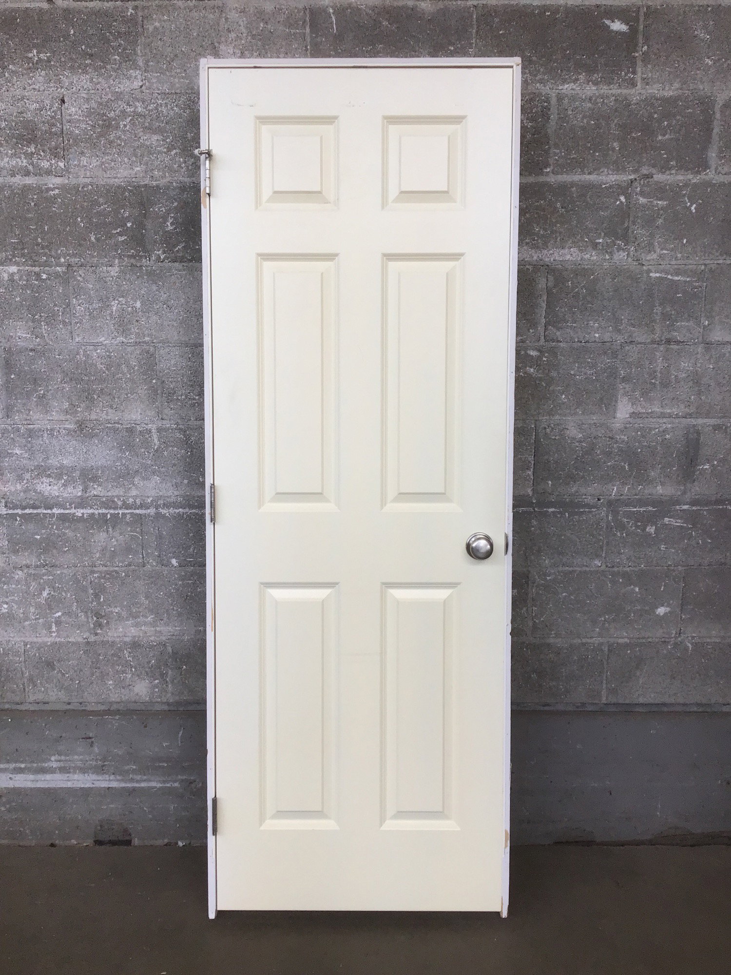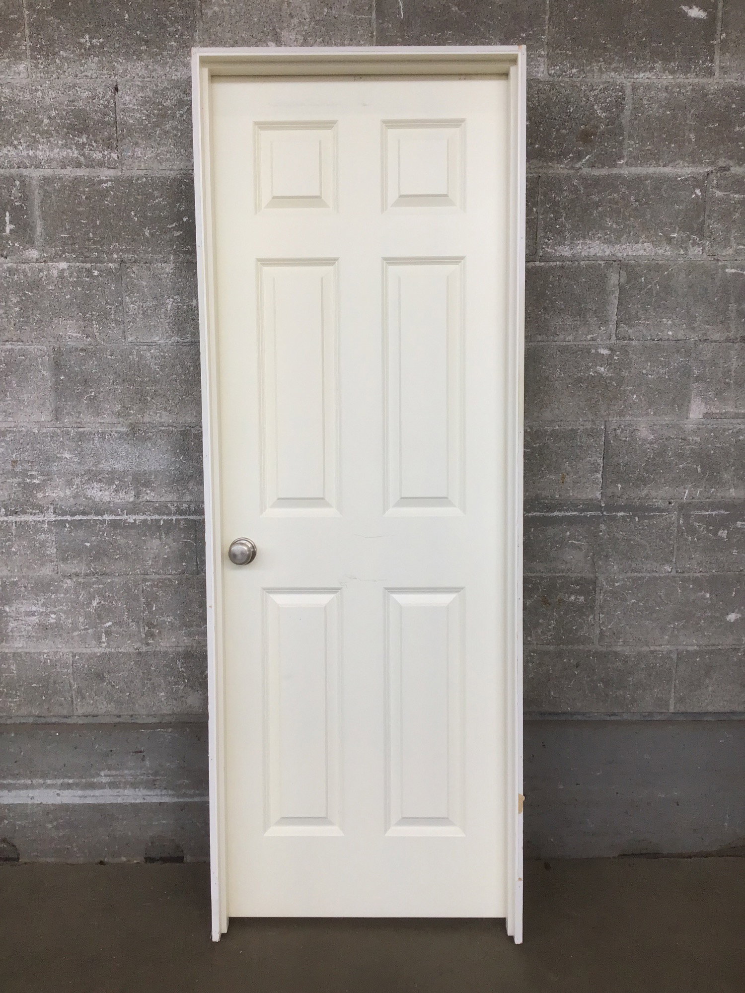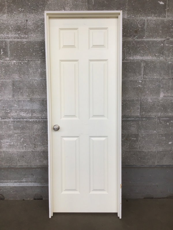 A 6 panel wooden pre hung interior door in a painted warm white finish. This has a right hand swing and would make good as a bedroom door.