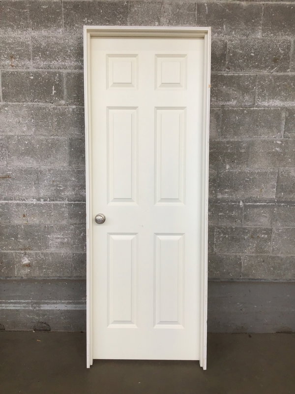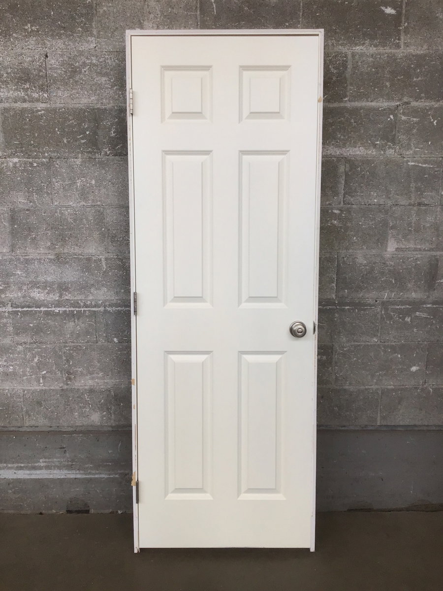 A 6 panel pre hung wooden interior door with a painted warm white finish. The door has brushed nickel hardware and would be great as a bedroom door.