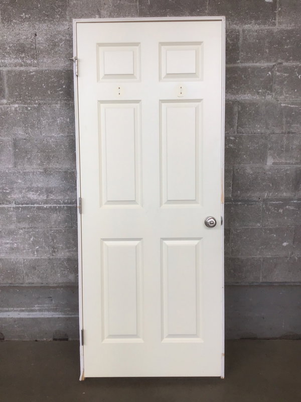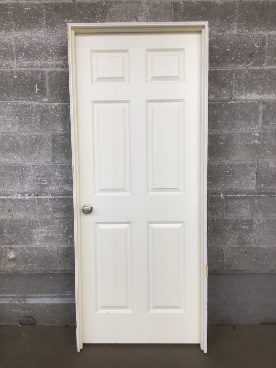A 6 panel pre hung wooden interior door with a painted warm white finish. The door has brushed nickel hardware and would be great as a bedroom door or bathroom door.