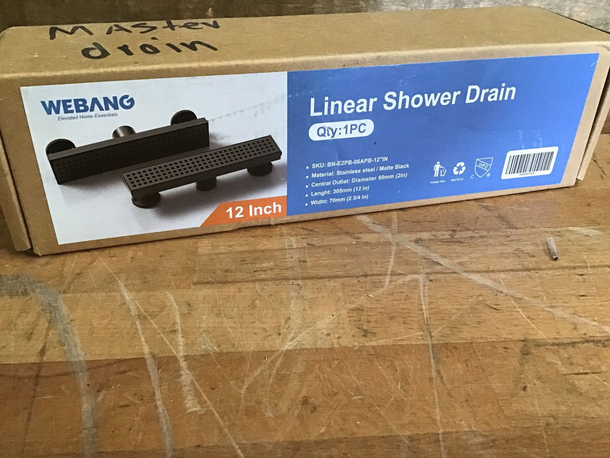 New in box, Webang 12" linear shower drain in a matte black color.