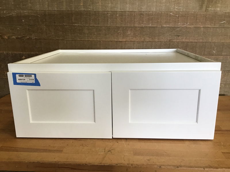 White two door upper cabinet. Needs hardware. In very good condition!