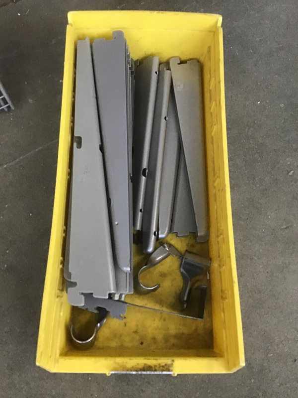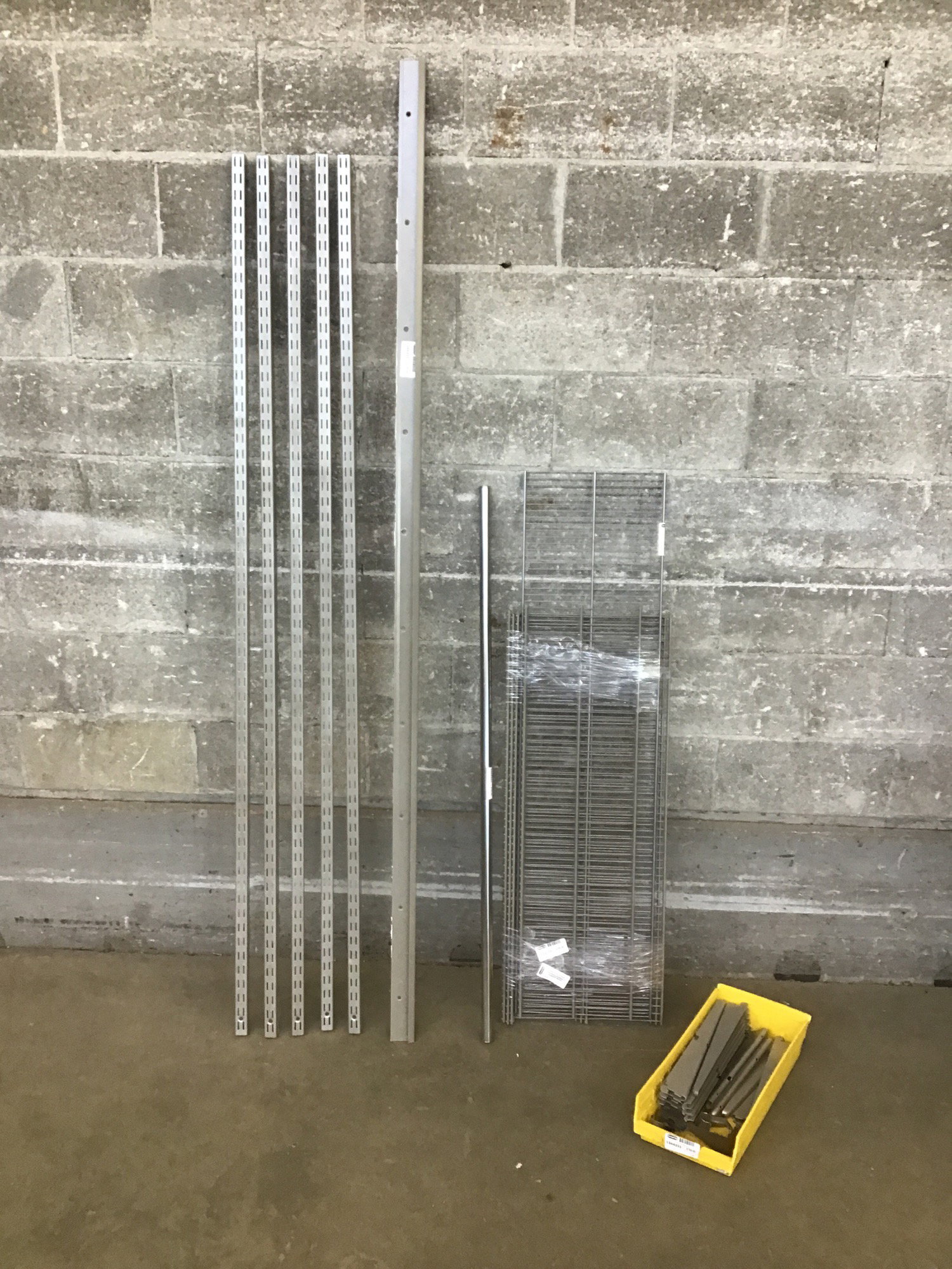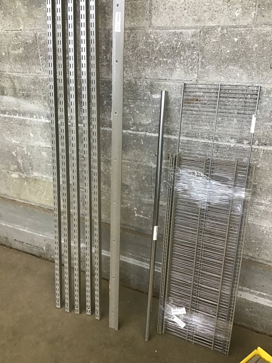 Kit of nice looking and clean wire shelving. It includes five 72 3/4" tall posts/standards, a 48" closet rod, twelve 13" long shelf arms, five ~11" long shelf arms, three 36 1/2" x 13" shelves, one @ 47 3/4" x 12", one @ 36 1/2" x 10" and some other small hardware.