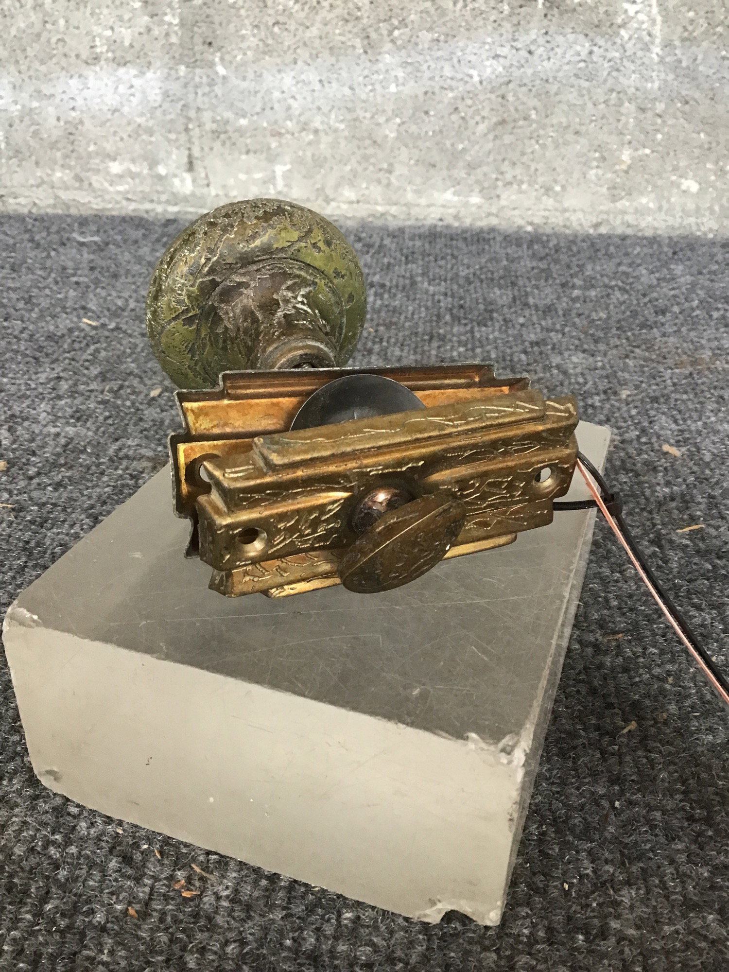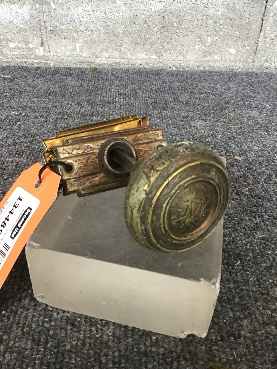 Vintage brass door knob and thumbturn with escutcheons featuring a crackly design with a witchy, branch sort of vibe.