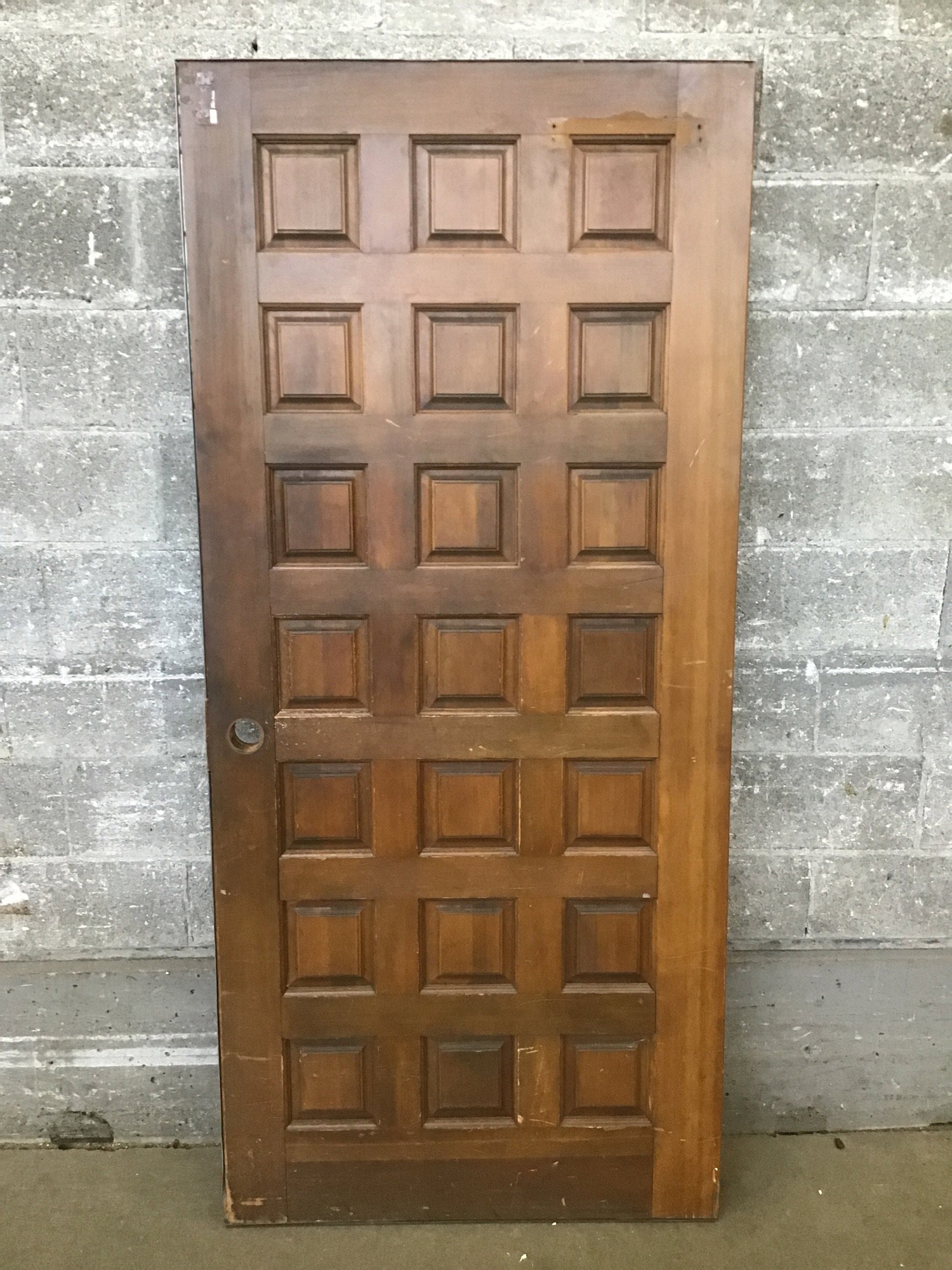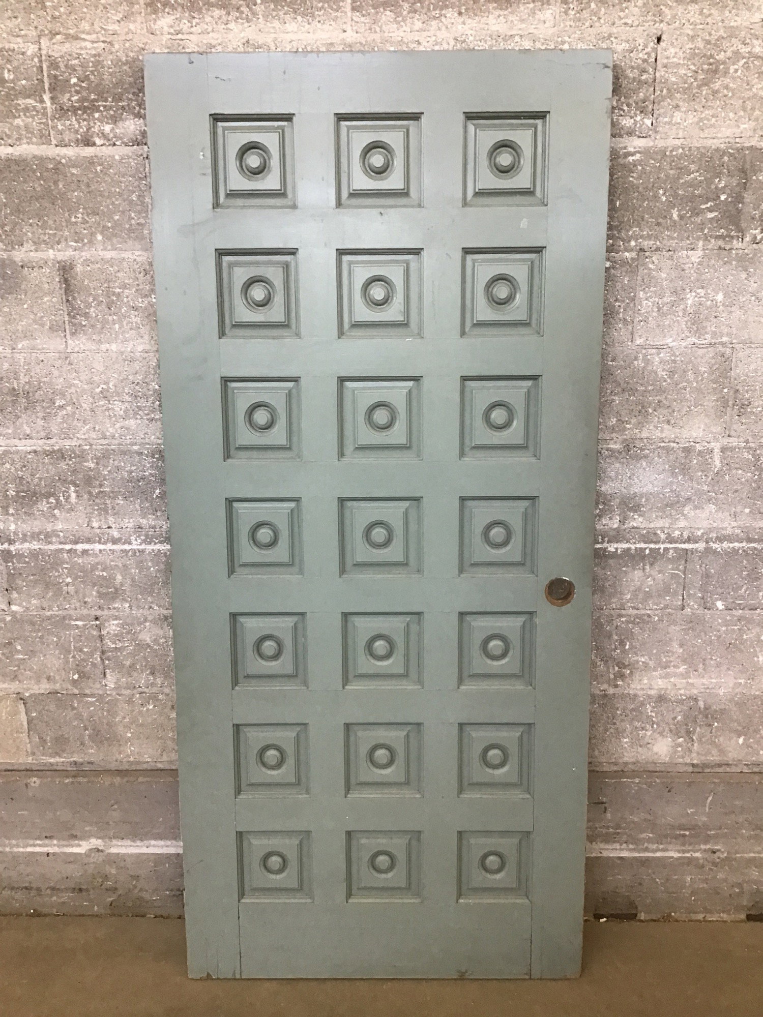 Vintage 21 panel exterior door with a bit of added flair on the exterior panels. In good shape structurally and in decent shape cosmetically. However, price reflects that this door has an older J hook style weather stripping that will need to be accounted for if reinstalling.