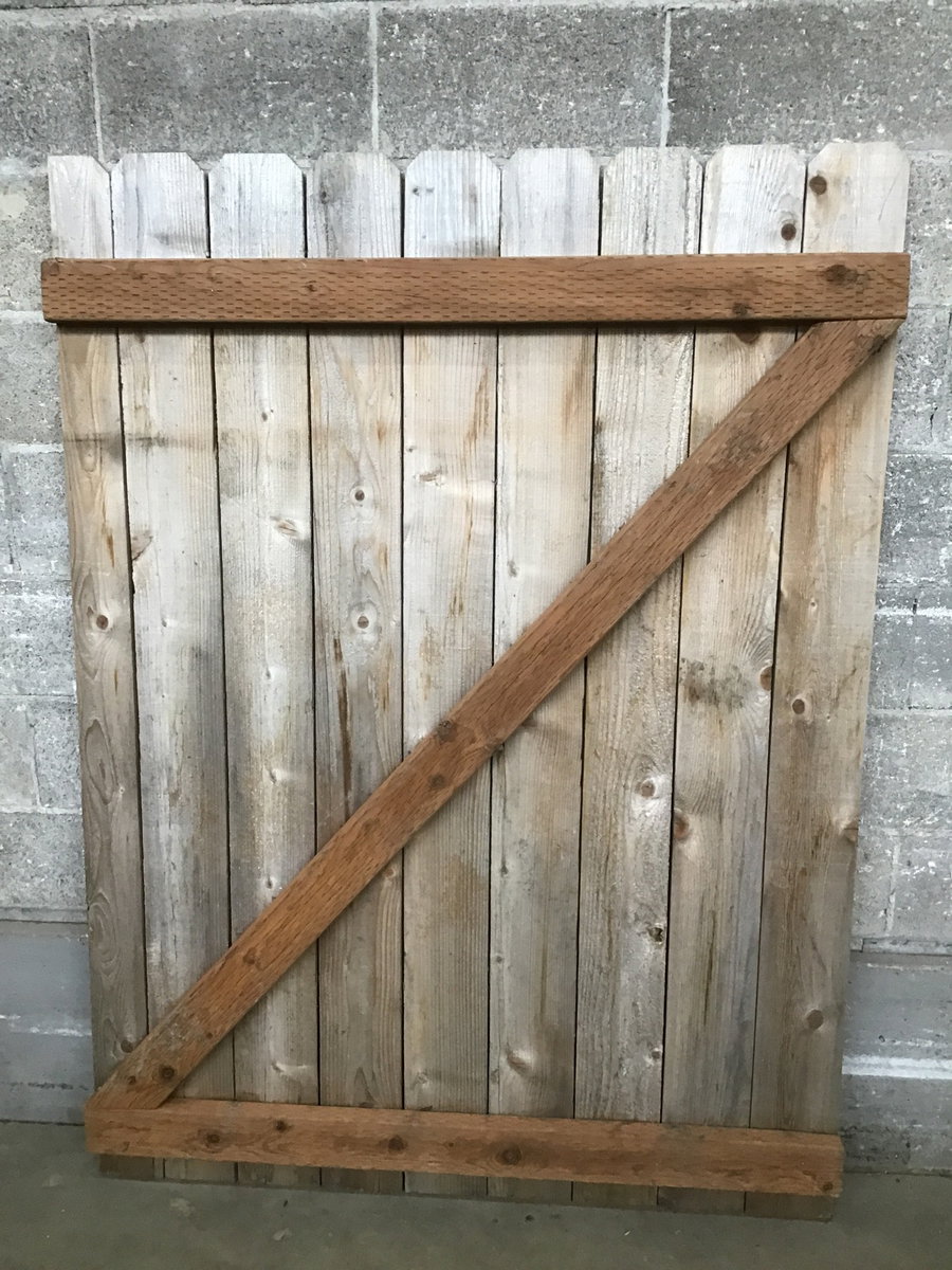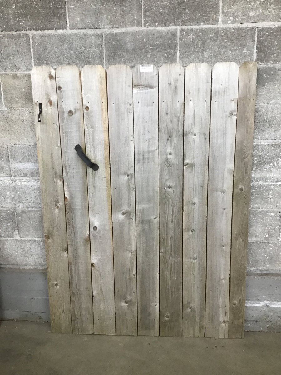A wood gate with a z-frame of pressure treated lumber and arched pine slats. There's a little strap handle on one side.