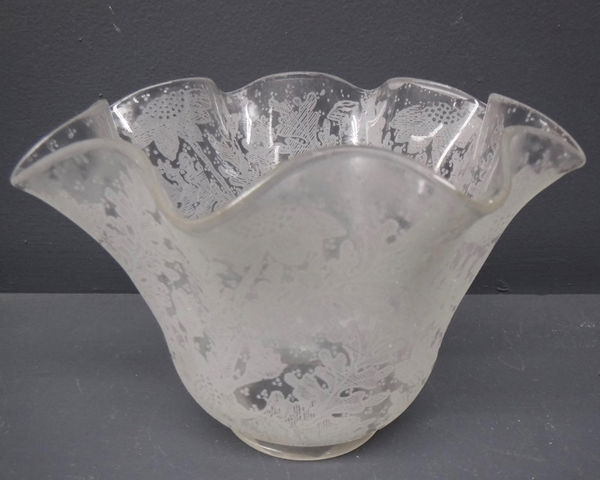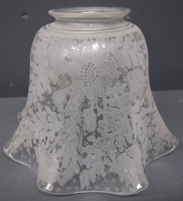 A beautiful frosted and etched glass shade for a Victorian chandelier, or wall sconce. Has a lovely Art Nouveau floral design of sunflowers or daisies. So pretty! Fits a 2 1/4" holder