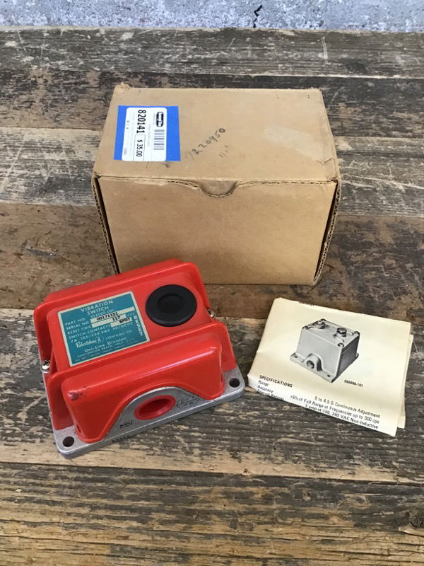 Immaculate, unused Robert Shaw brand vibration switch from 1969 with a red weather resistant cover. Includes instructions and original box. I guess if you hooked this sucker up it would bring you all the vibration switch power you would expect from the late 60's! Specs: Model SS6000-001, 7 AMP unit, S.P.D.T. switch, 0 to 4/5 G range, 120240 VAC.